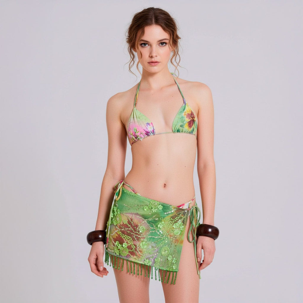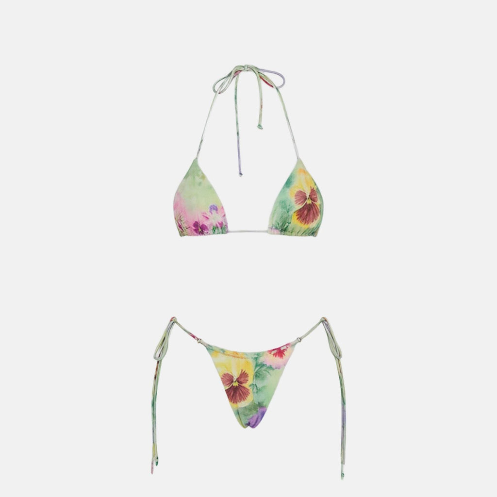 Biquíni cortininha com top triangular ajustável por amarrações no pescoço e costas. Calcinha modelo tanga com laterais de tiras finas reguláveis. Estampa floral multicolorida em fundo verde claro. Acabamento em costura reforçada e elástico embutido.