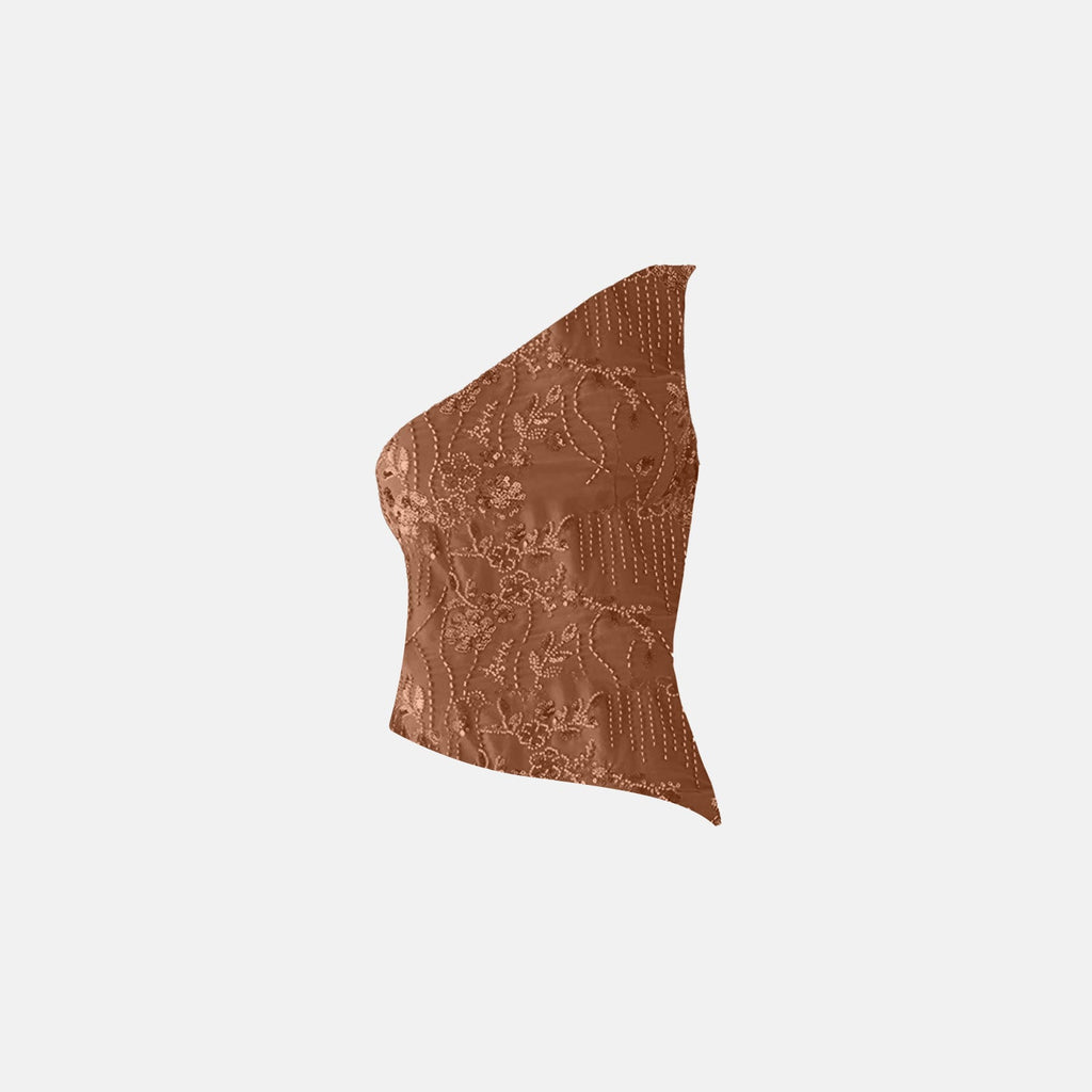 Blusa de um ombro só, modelagem ajustada ao corpo, tule bordado com paetês e miçangas, detalhe floral aplicado e acabamento interno forrado.