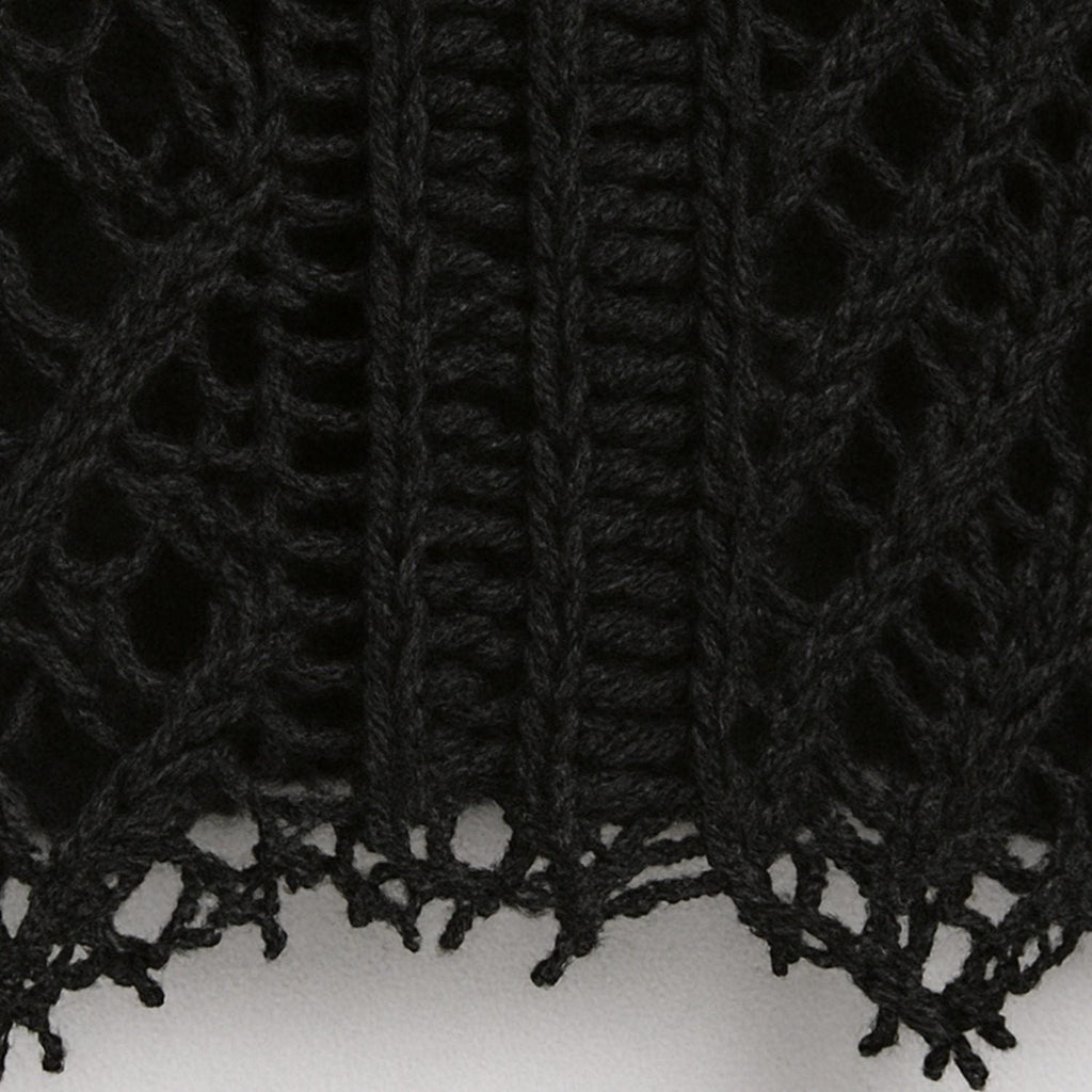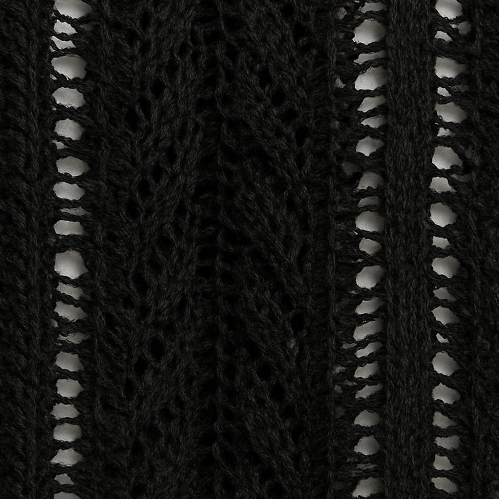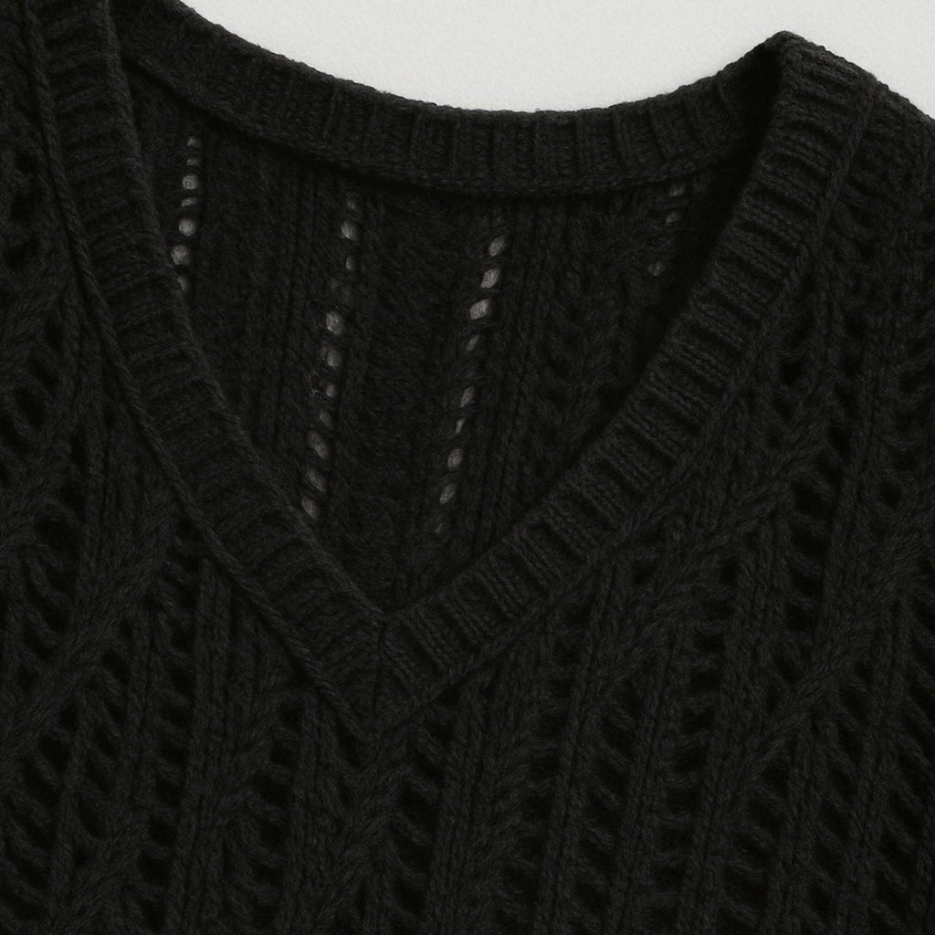 Sobreposição ampla em tricot vazado com ponto trabalhado e efeito destroyed nas barras e mangas. Modelagem oversized com decote V profundo e caimento fluido, ideal para sobrepor biquínis ou tops.