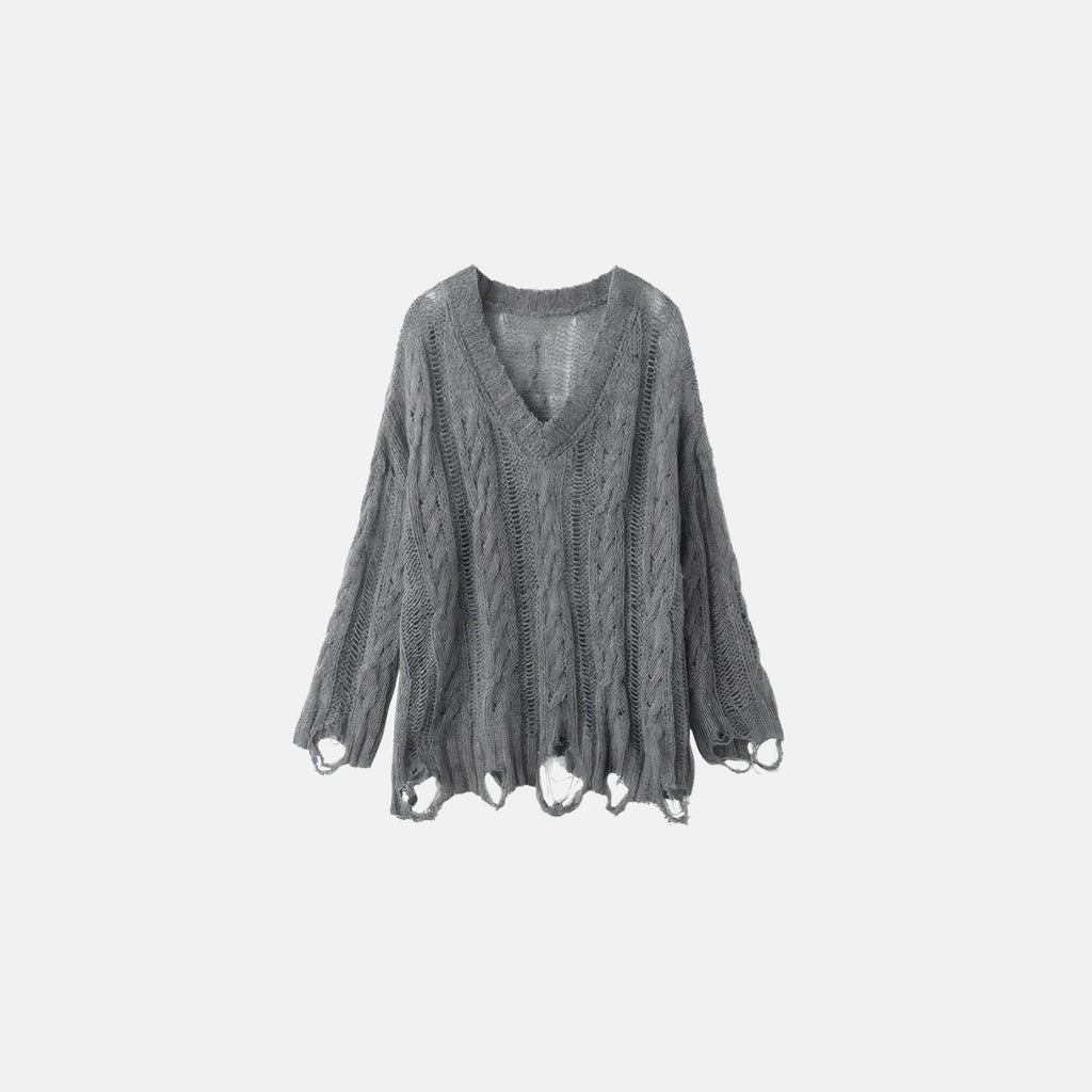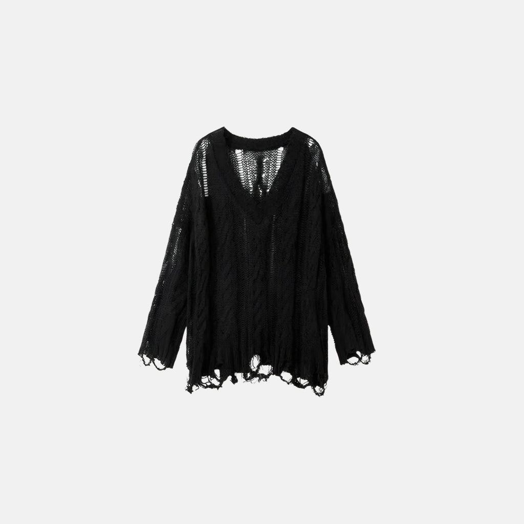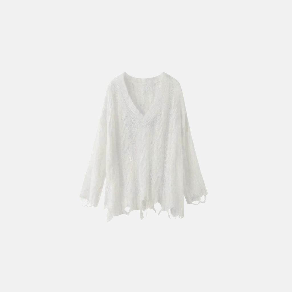 Sobreposição ampla em tricot vazado com ponto trabalhado e efeito destroyed nas barras e mangas. Modelagem oversized com decote V profundo e caimento fluido, ideal para sobrepor biquínis ou tops.