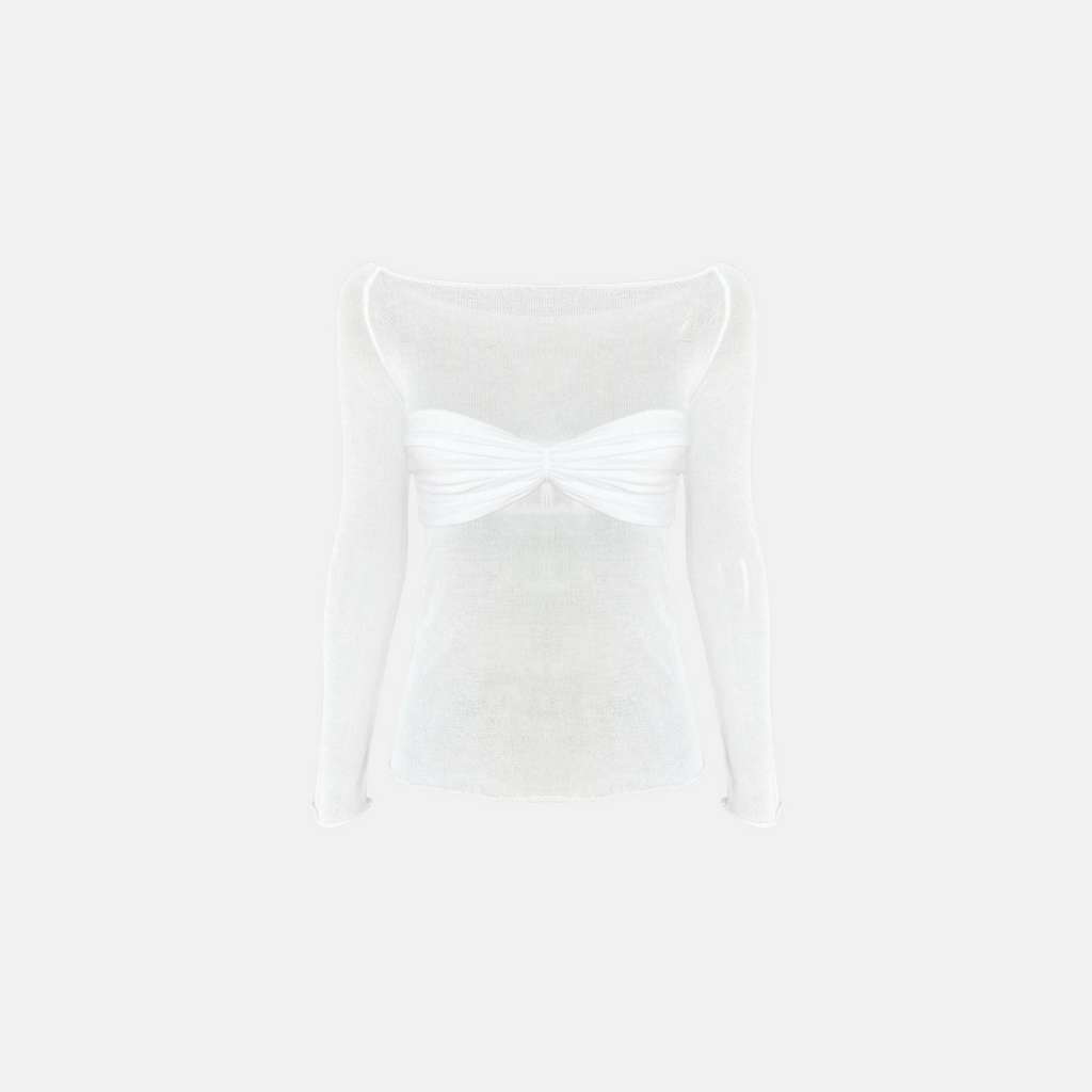 Blusa de manga longa com decote reto e franzido no busto. Ajuste ao corpo, acabamento transparente.