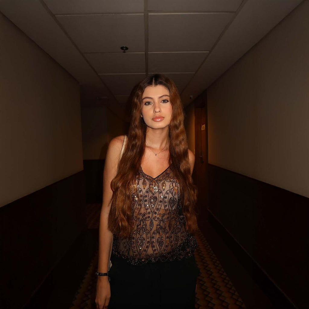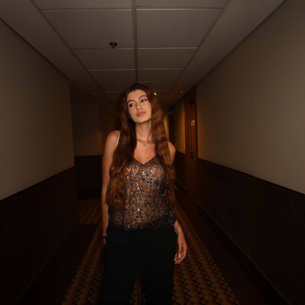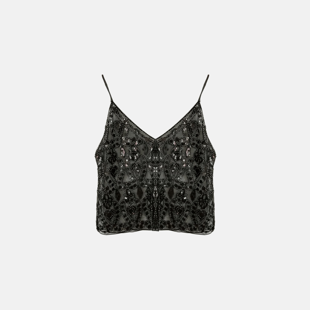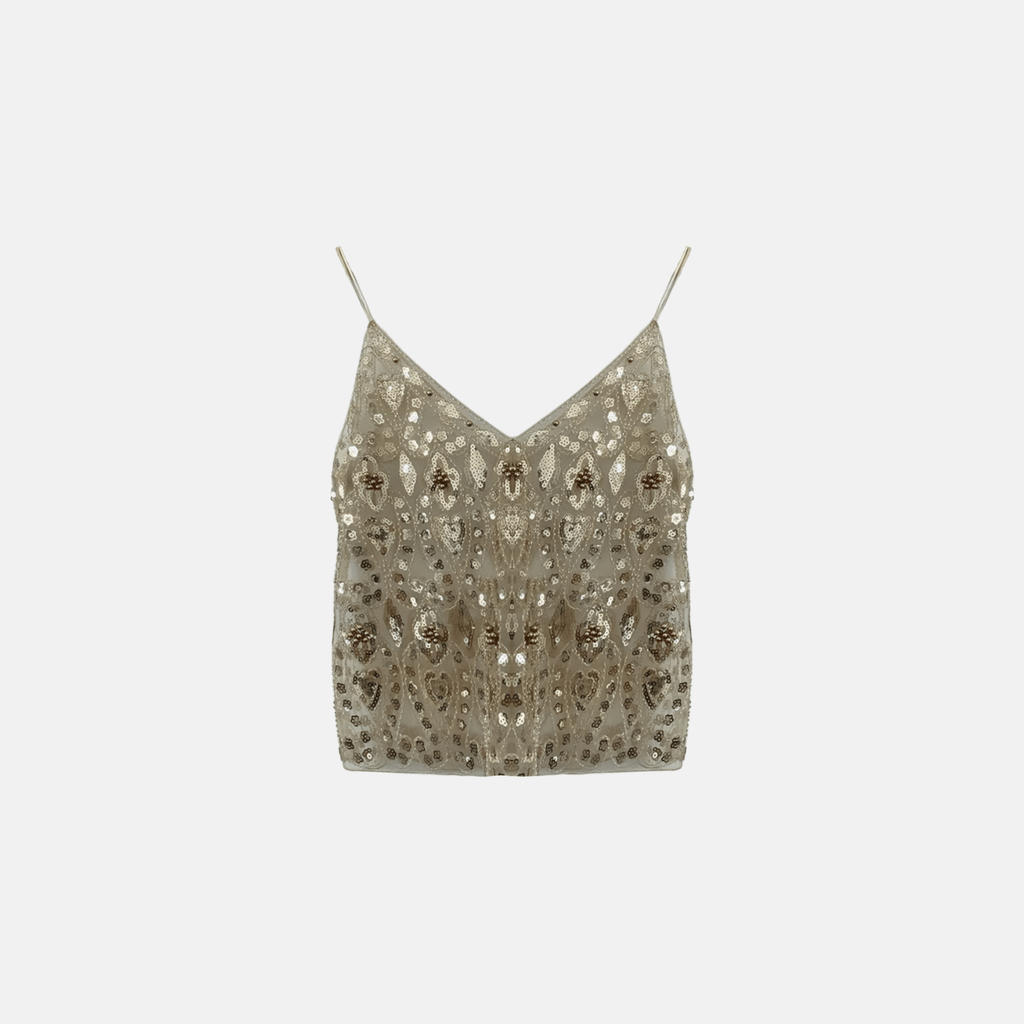 Blusa de alças finas com decote em V. Adornados com lantejoulas e pedrarias delicadas. Acabamento refinado e modelagem solta.