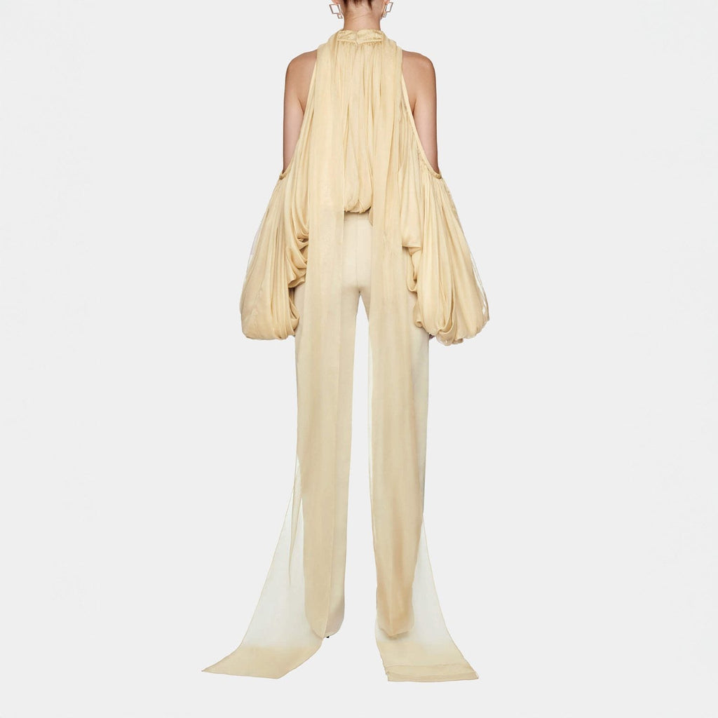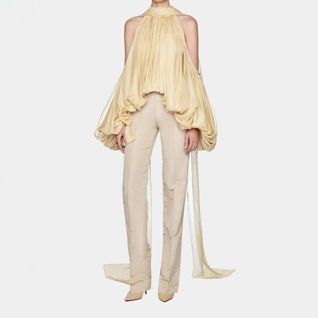 Blusa de modelagem ampla com gola alta e recortes nos ombros. Mangas volumosas drapeadas e caimento fluido. Barra traseira alongada com tiras esvoaçantes.