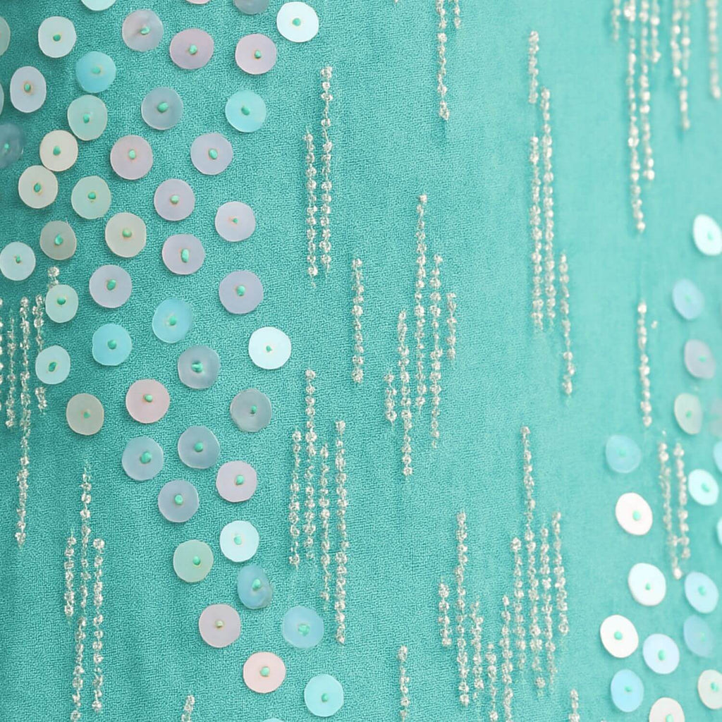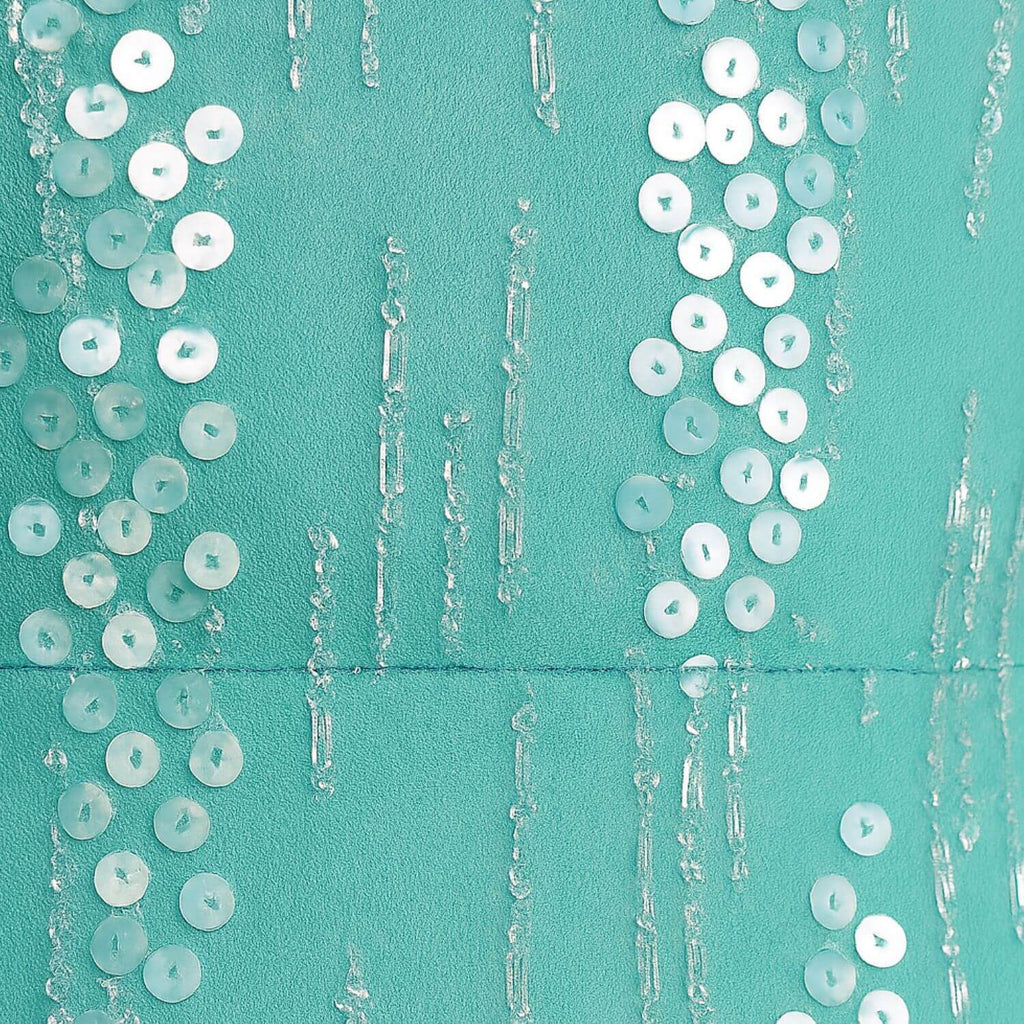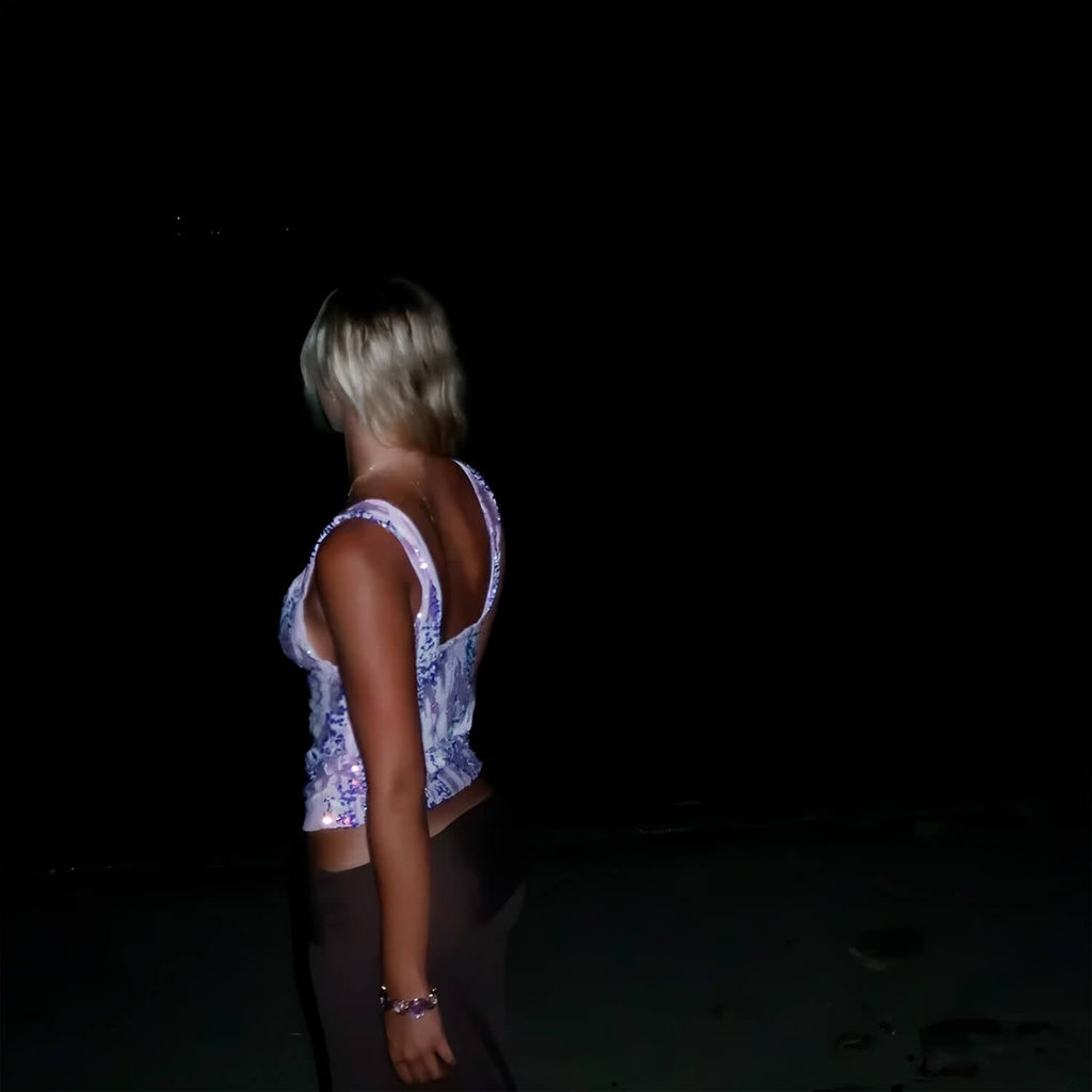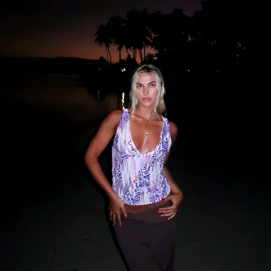 Blusa sem mangas com decote V profundo. Estrutura ajustada com aplicação de lantejoulas e pedrarias em efeito cascata. Fechamento posterior com zíper invisível. Tecido com leve brilho.