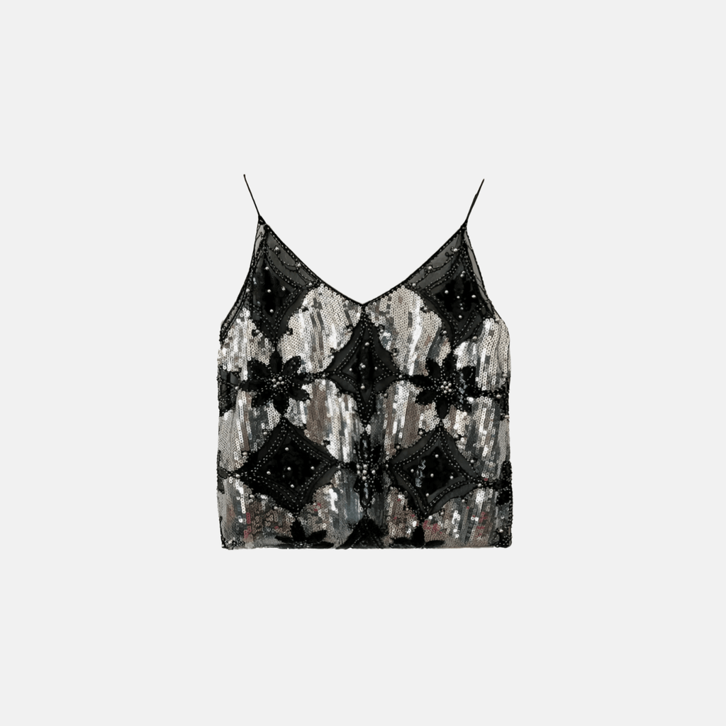 Top de alças finas com decote em V. Bordados florais em tecido transparente, adornados com lantejoulas e pedrarias delicadas. Acabamento refinado e modelagem solta.