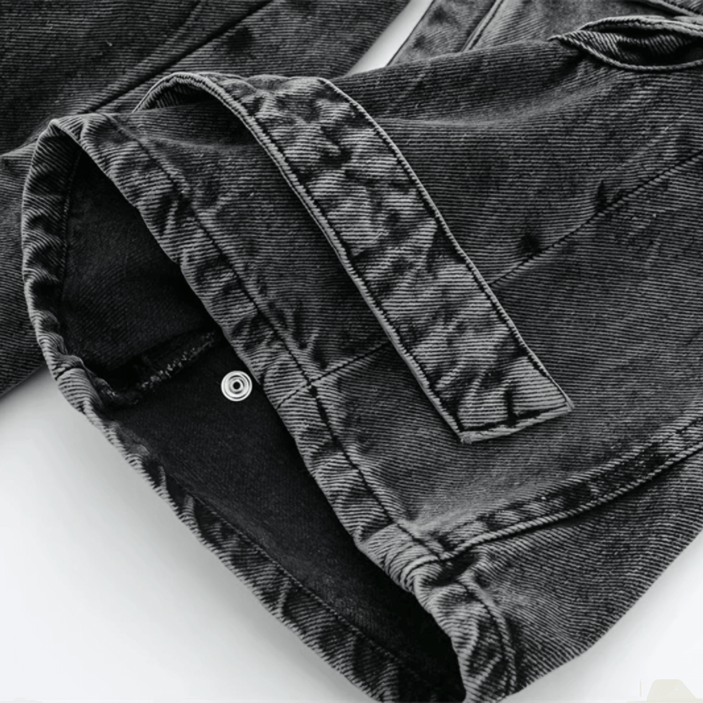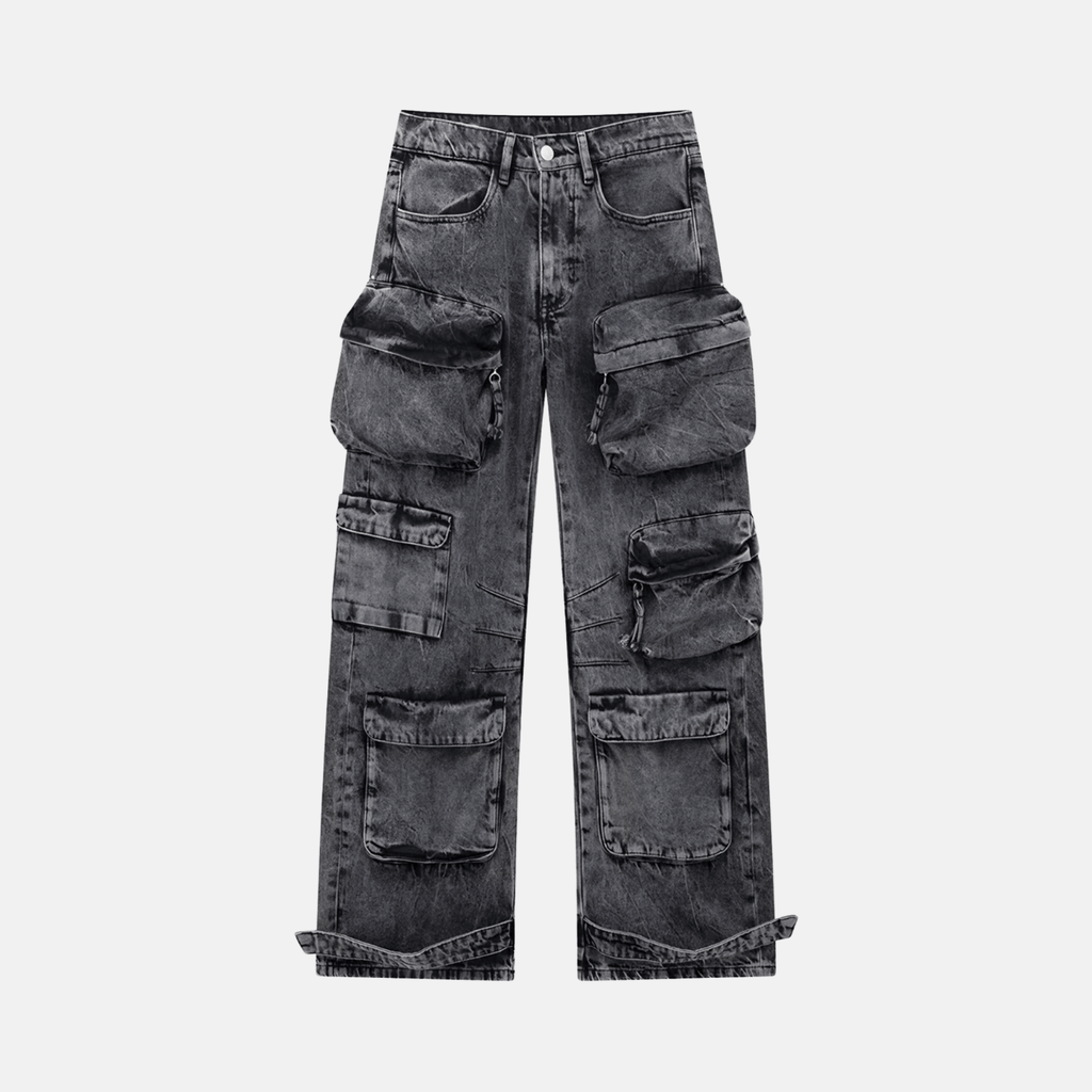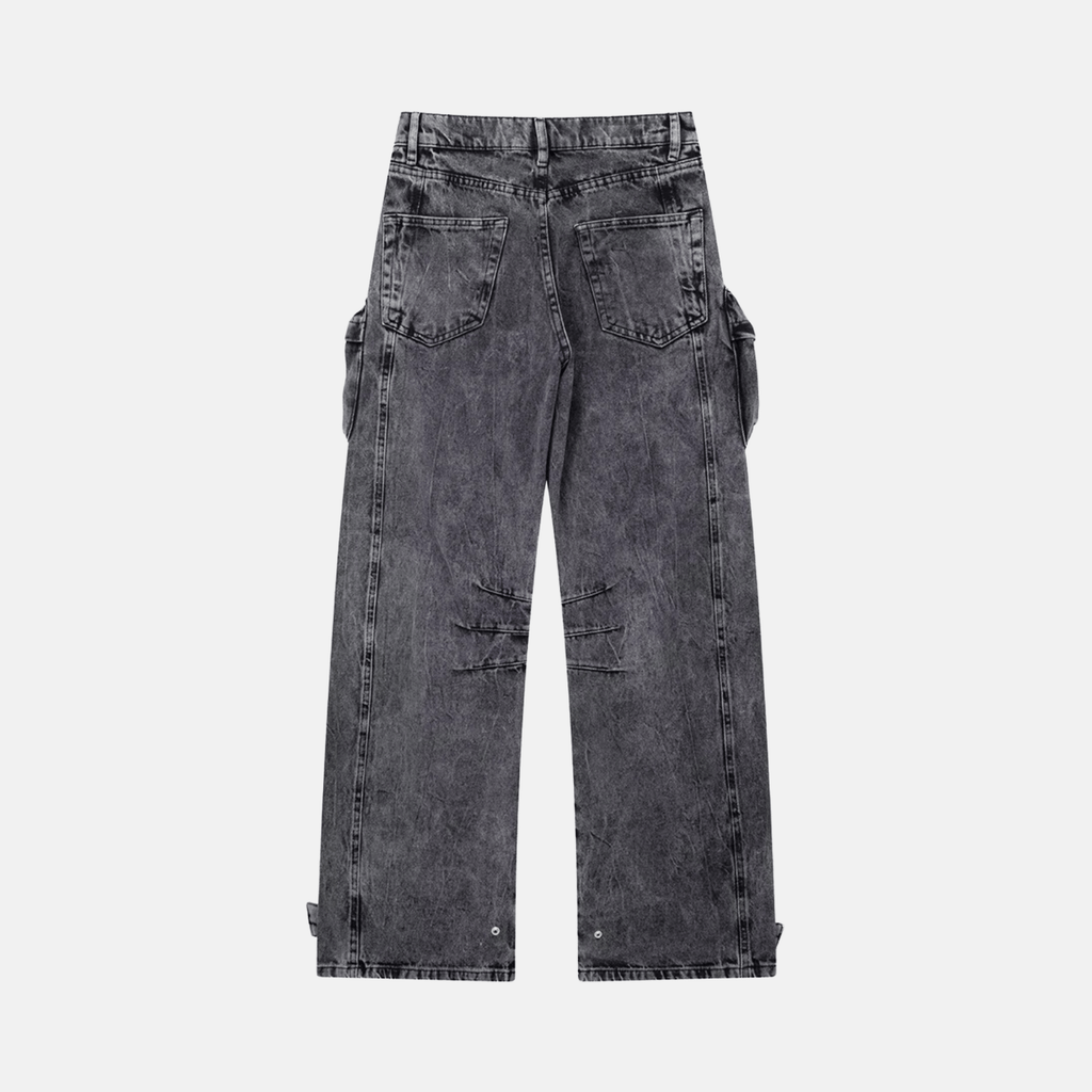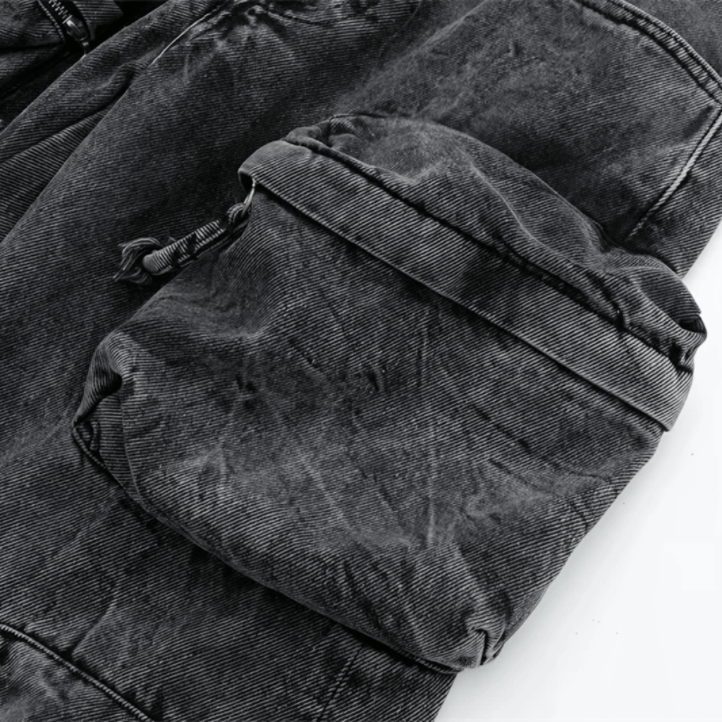 Calça cargo oversized com bolsos grandes e detalhados. Fecho frontal com zíper e botão metálico. Acabamento desbotado. Modelagem larga com ajuste solto e barra ajustável com botões.
