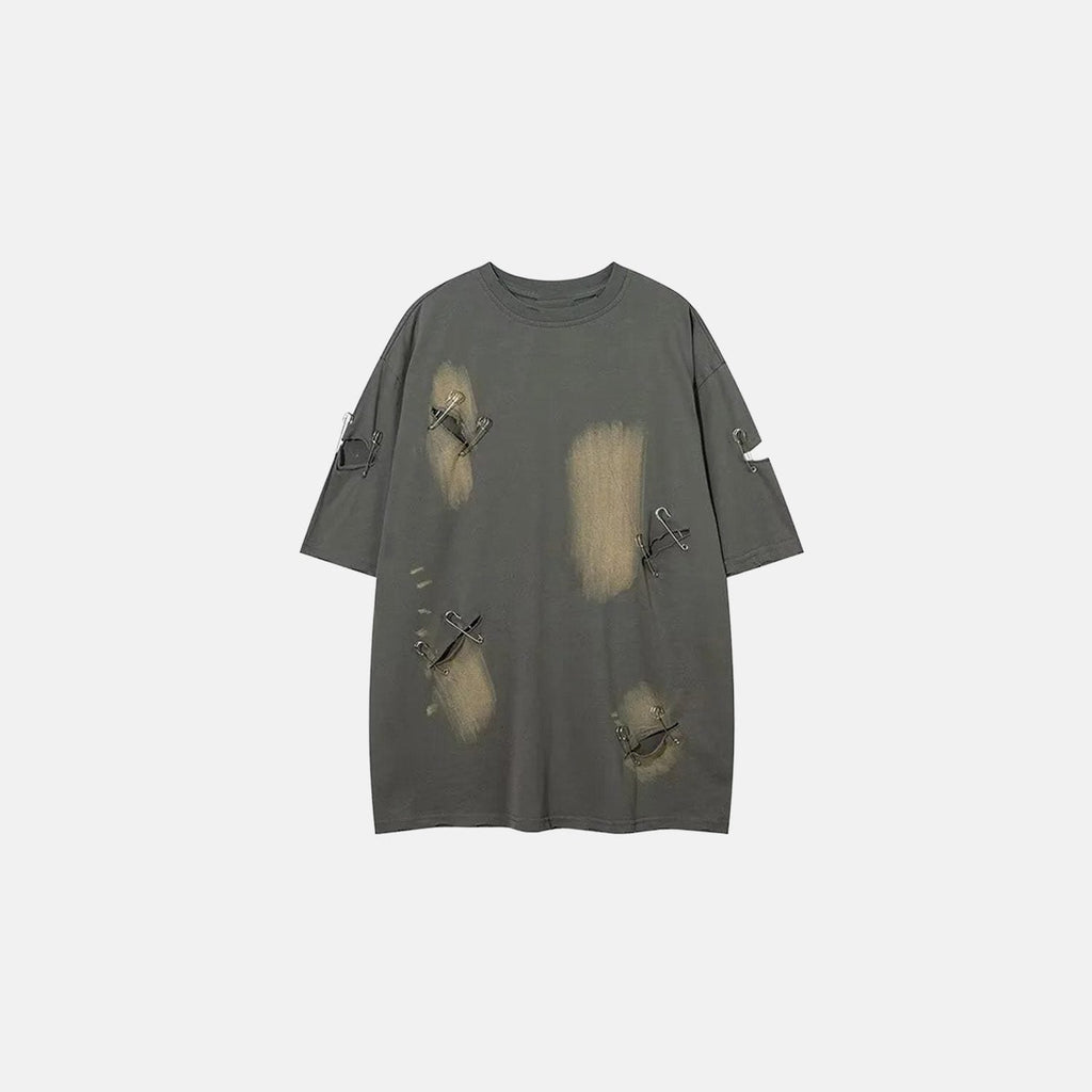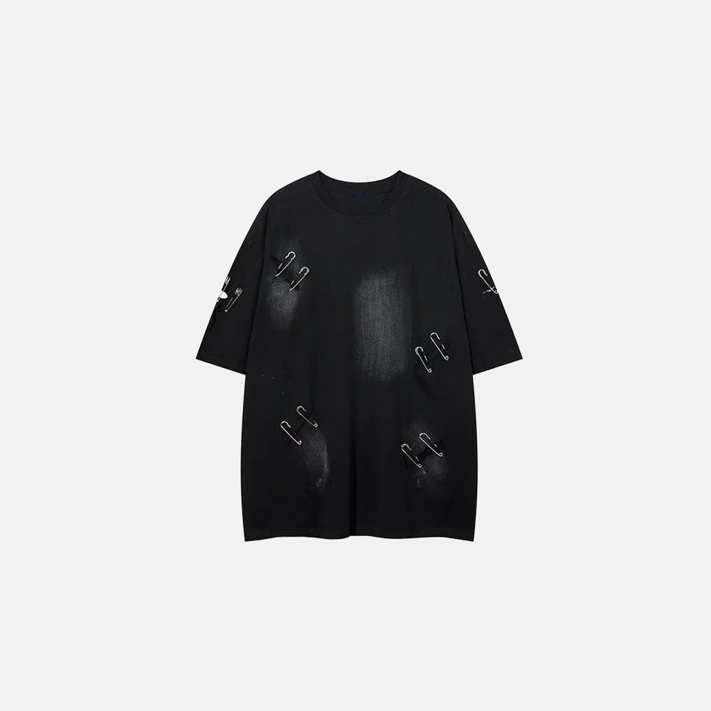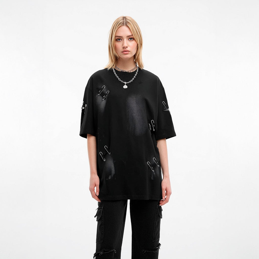 Camiseta oversized com acabamento desfiado e manchas desbotadas. Detalhes de recortes irregulares fixados com alfinetes metálicos aplicados em pontos estratégicos.