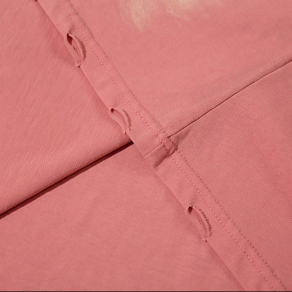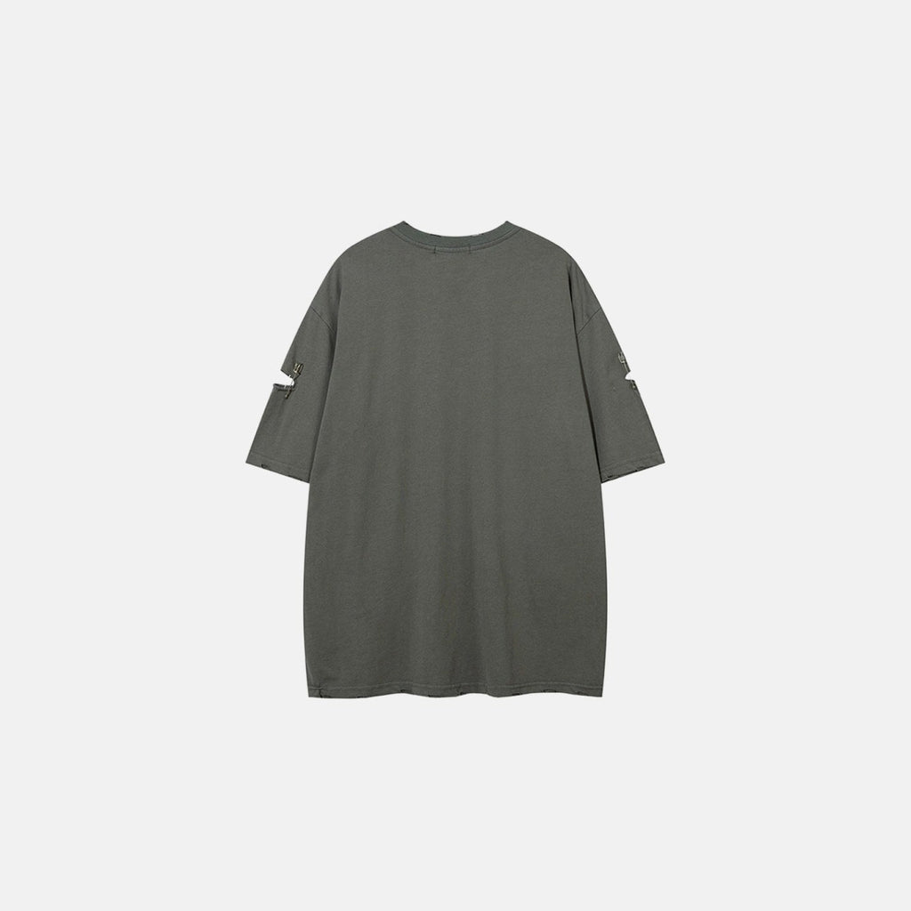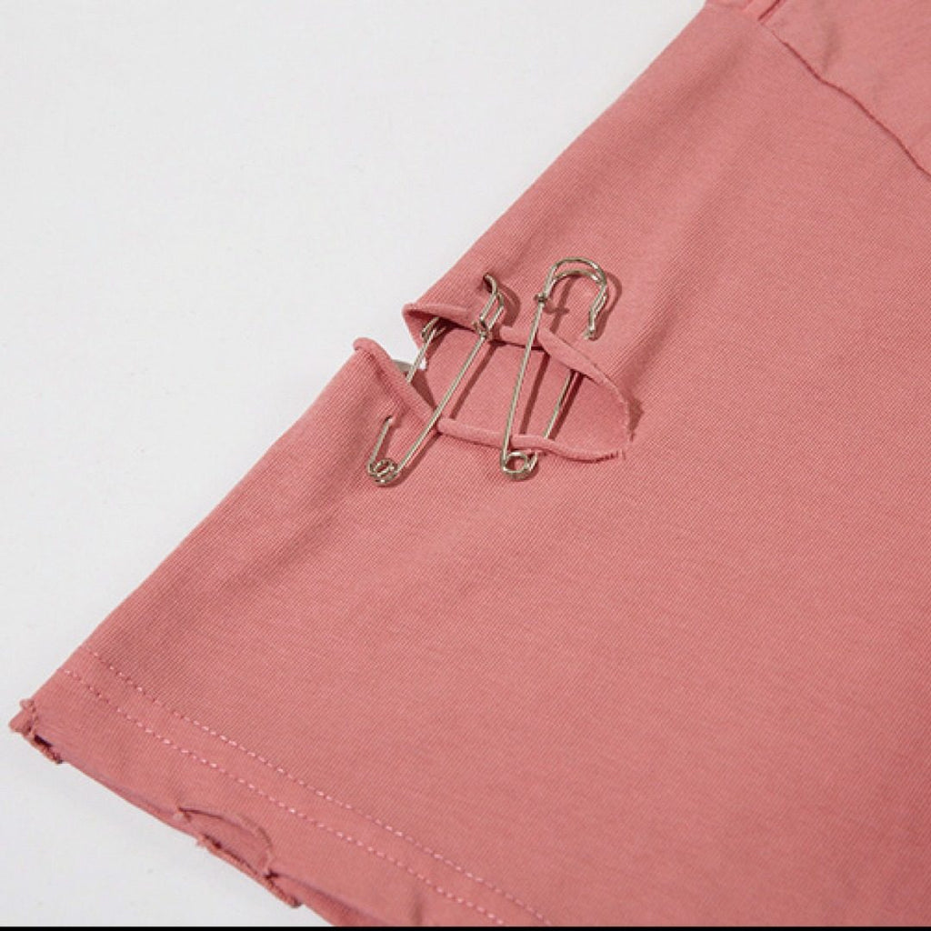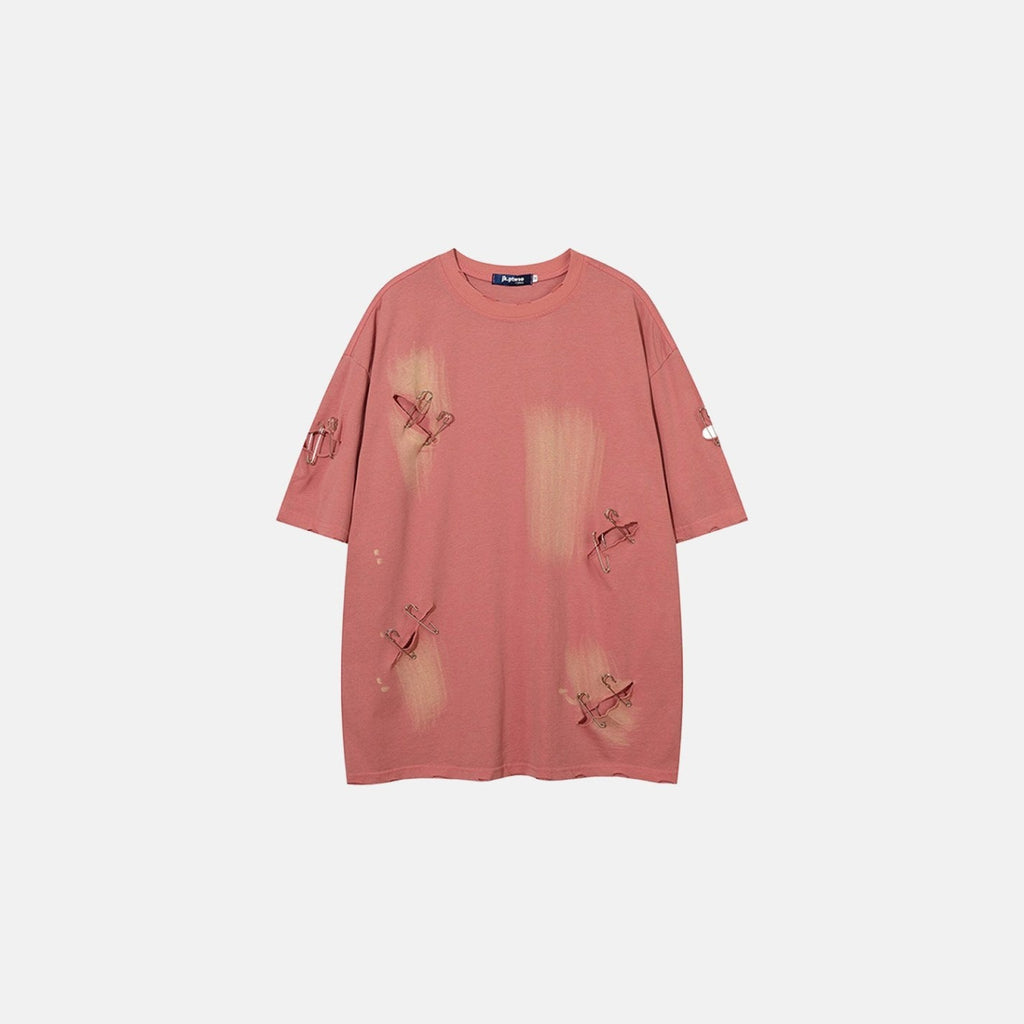 Camiseta oversized com acabamento desfiado e manchas desbotadas. Detalhes de recortes irregulares fixados com alfinetes metálicos aplicados em pontos estratégicos.