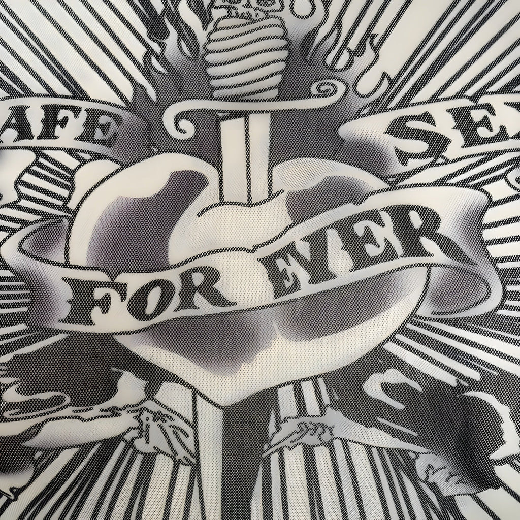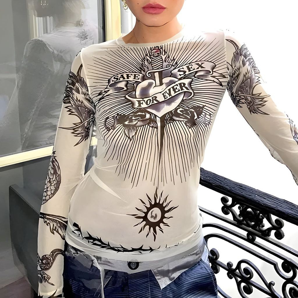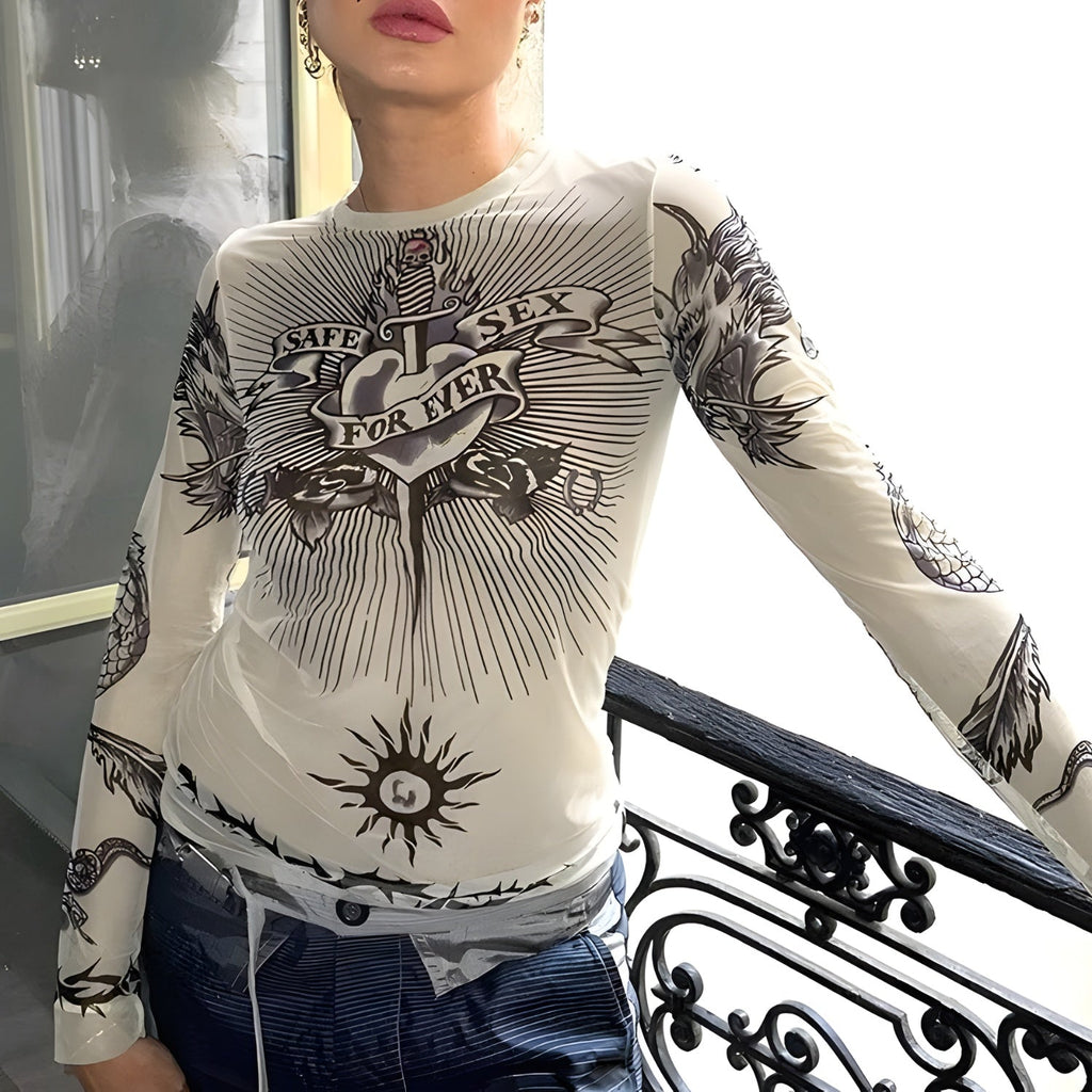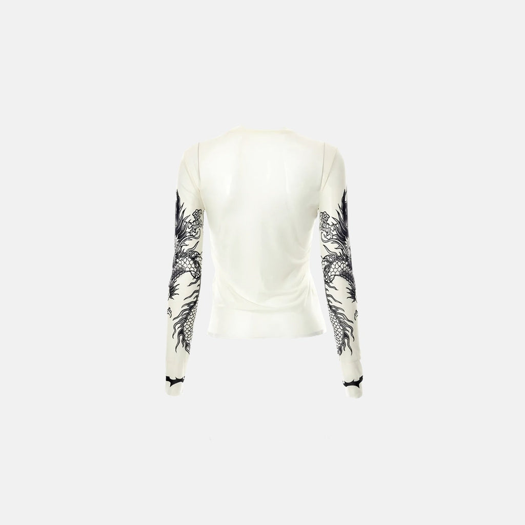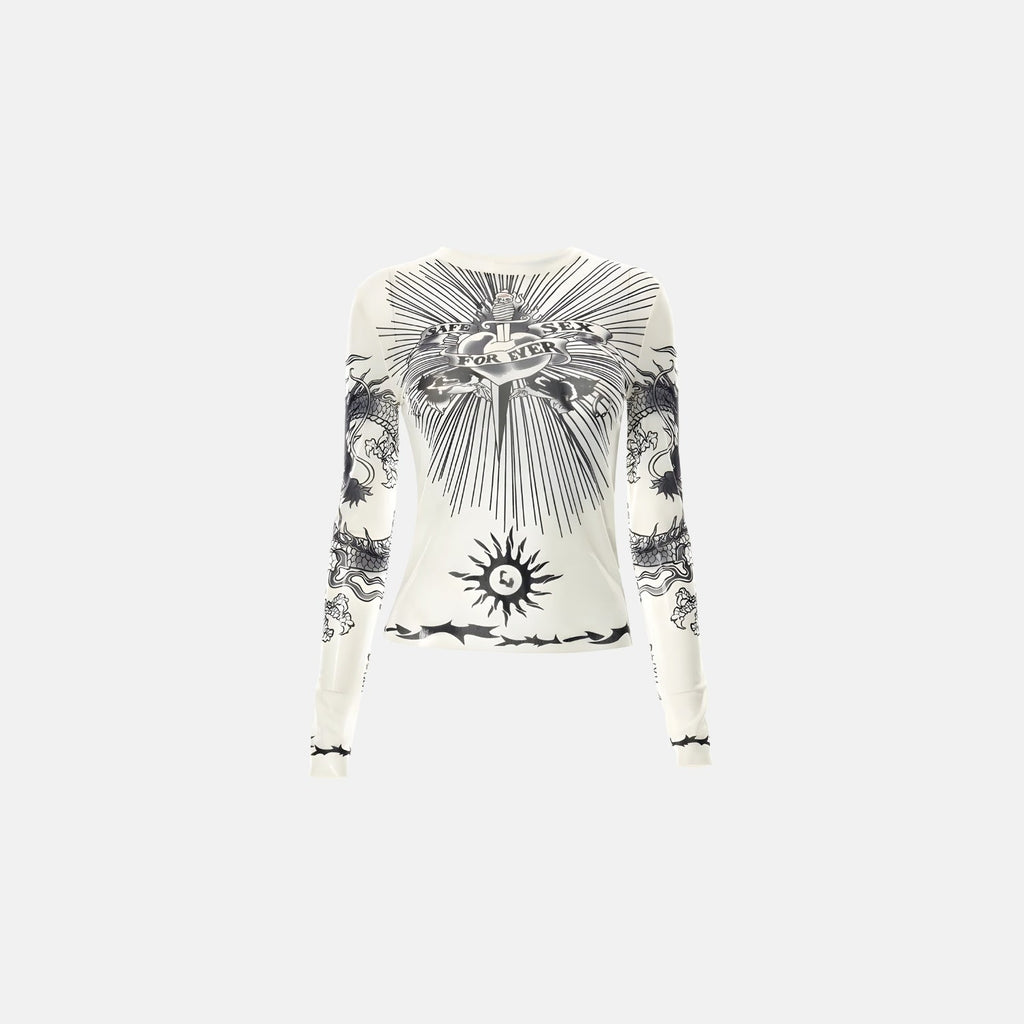 Blusa de manga longa ajustada ao corpo, confeccionada em tecido translúcido. Estampa frontal com gráfico centralizado de punhal e coração, desenhos de dragões nas mangas e detalhes solares. Acabamento de costura fina e elasticidade suave.