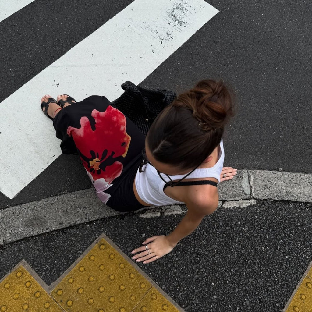 Conjunto de top cropped sem mangas e saia longa com estampa floral. Top com decote fechado e saia com cós elástico e transparência sutil.