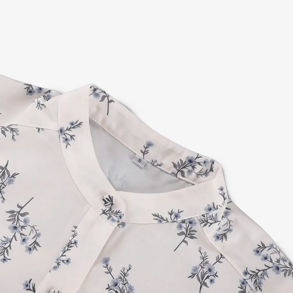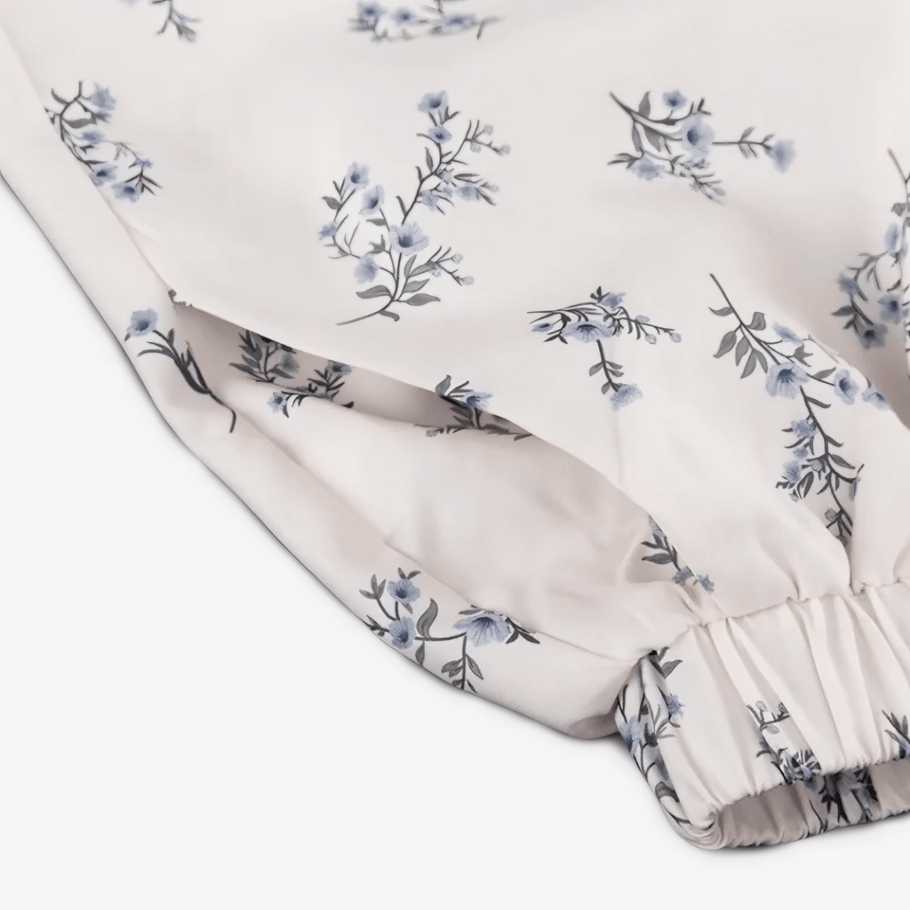 Blusa com mangas bufantes e punhos elásticos. Decote V com fechamento frontal em botões. Detalhe peplum em camadas. Short de cintura alta com elástico ajustável. Estampa floral delicada.