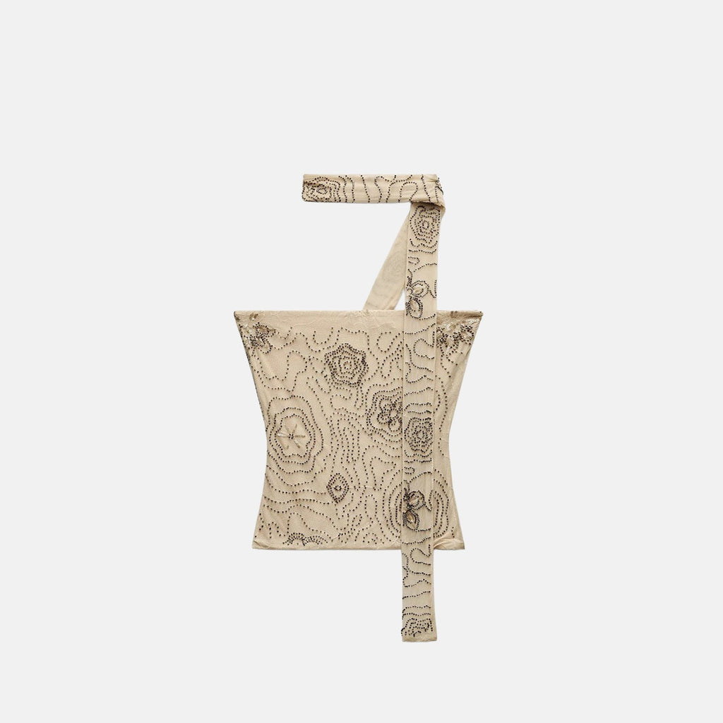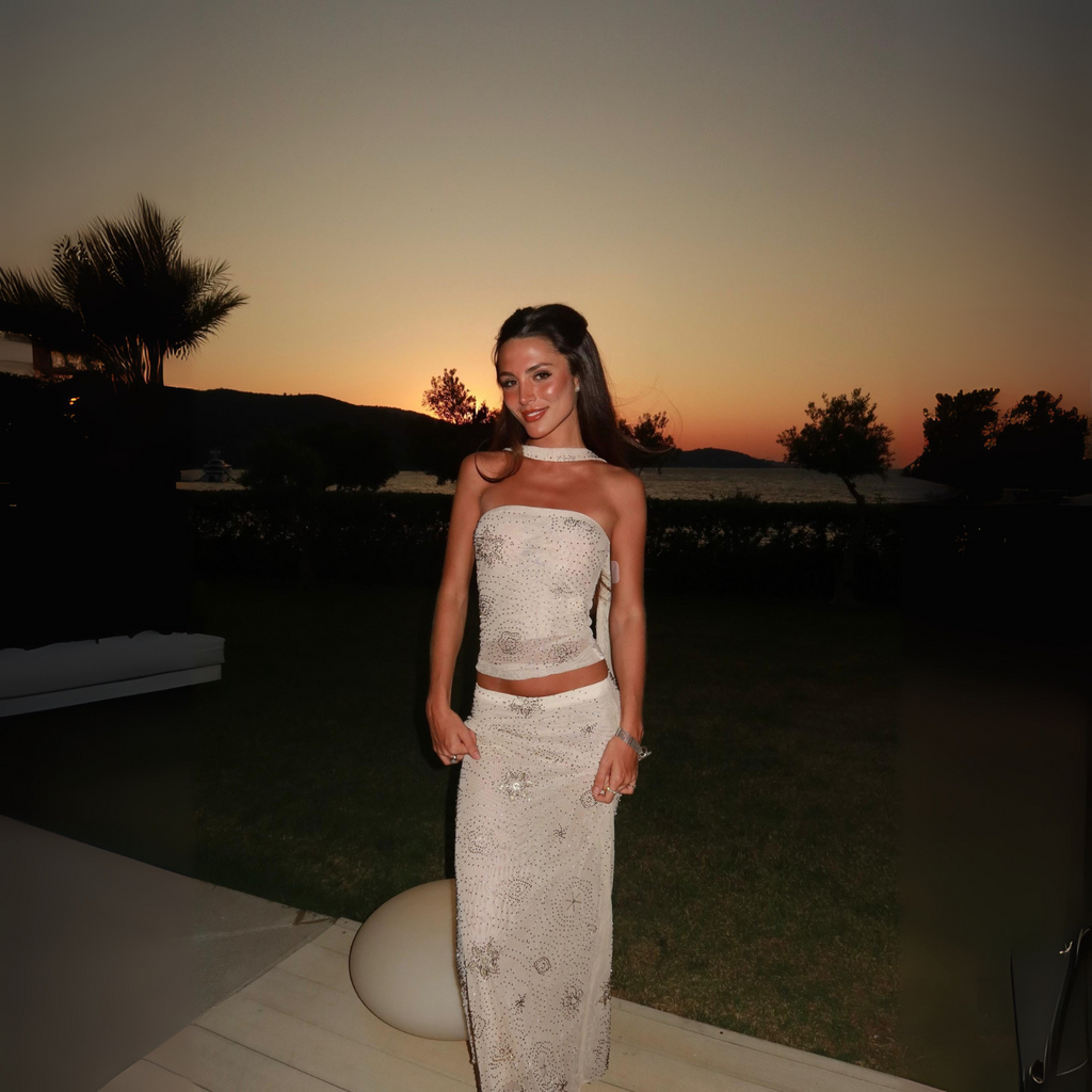 Conjunto de saia longa reta com cintura alta e top tomara que caia, ambos em tule bordado com miçangas e paetês, detalhes geométricos, acabamento forrado e faixa removível.