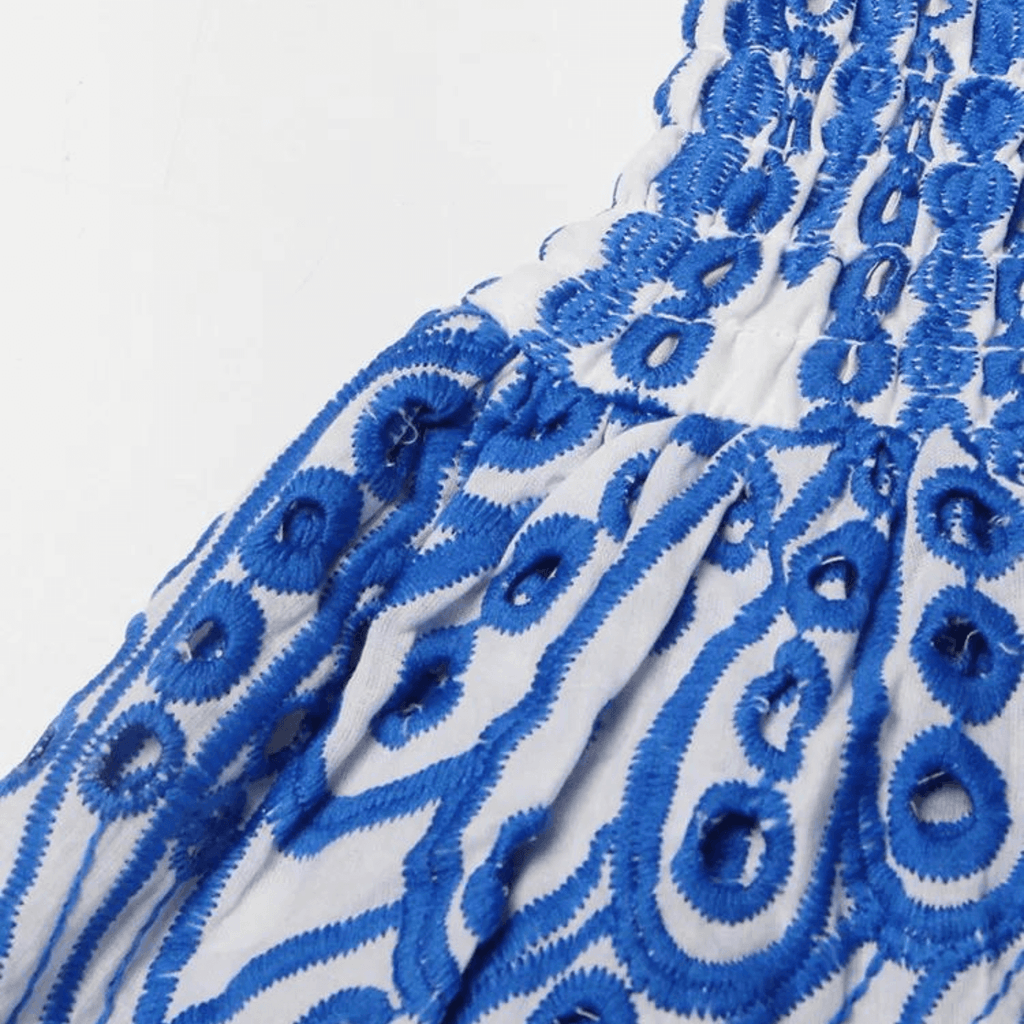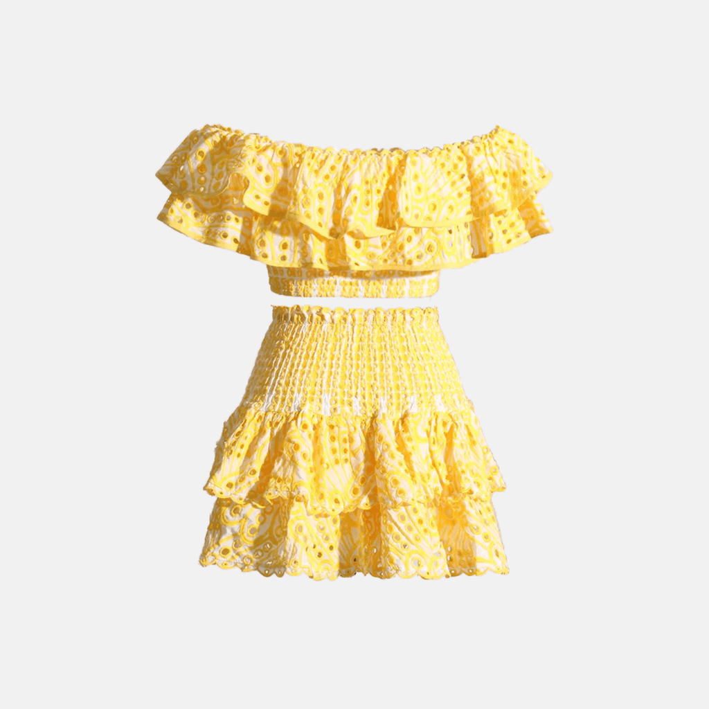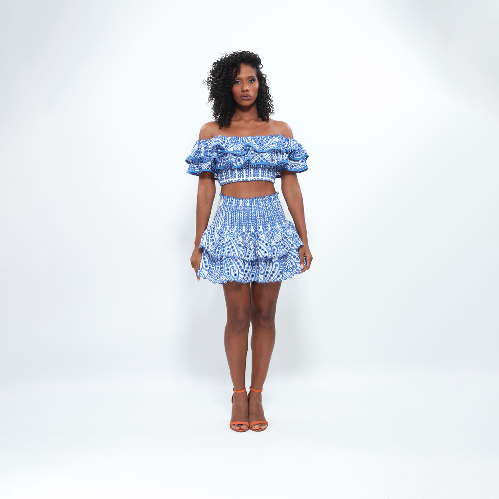 Conjunto de top e saia com detalhes franjados. Top ombro a ombro com babados. Saia de cintura alta com babados e cós elástico.
