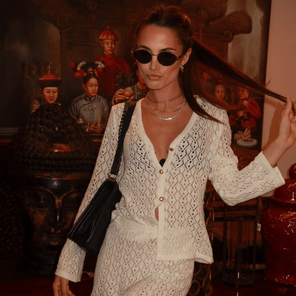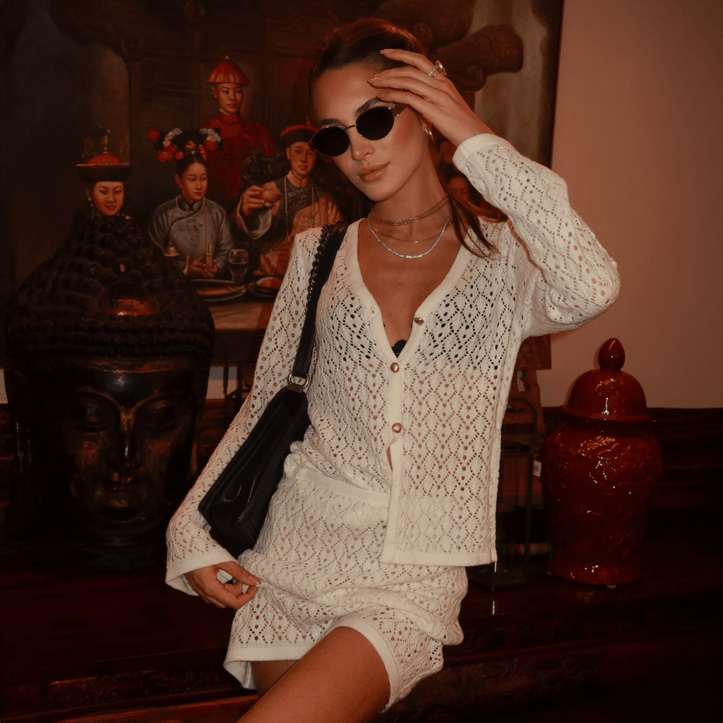 Conjunto composto por cardigan de manga longa com fecho frontal em botões decorativos de pérolas e saia curta de cintura alta. Trama rendada em crochê, acabamento detalhado e modelagem ajustada ao corpo.