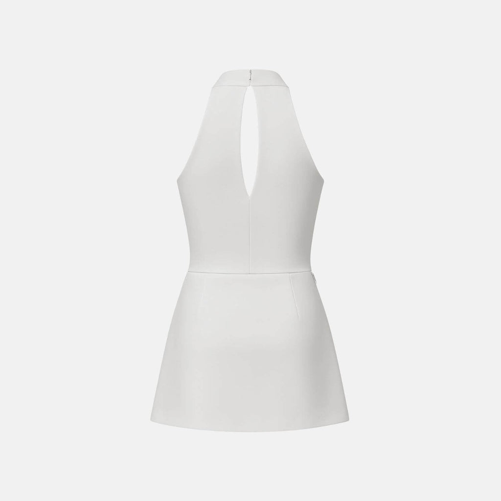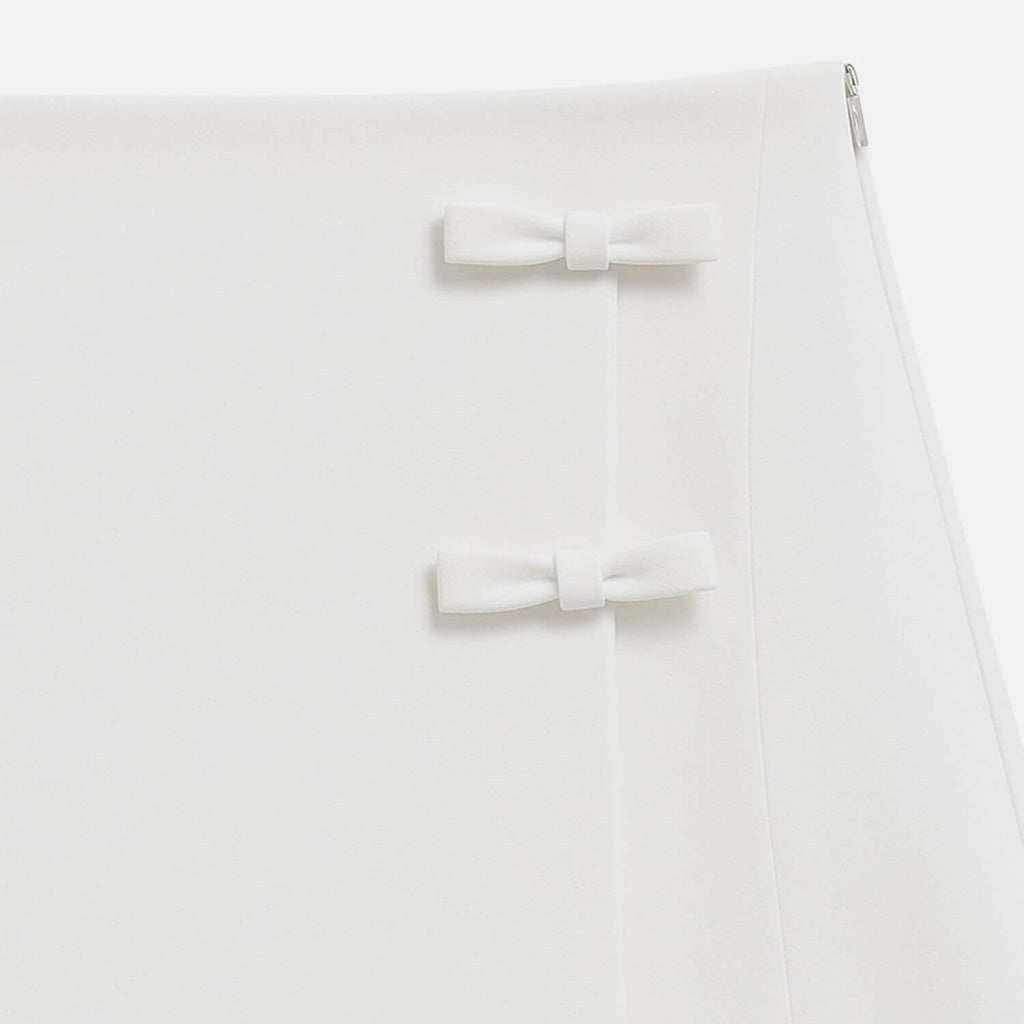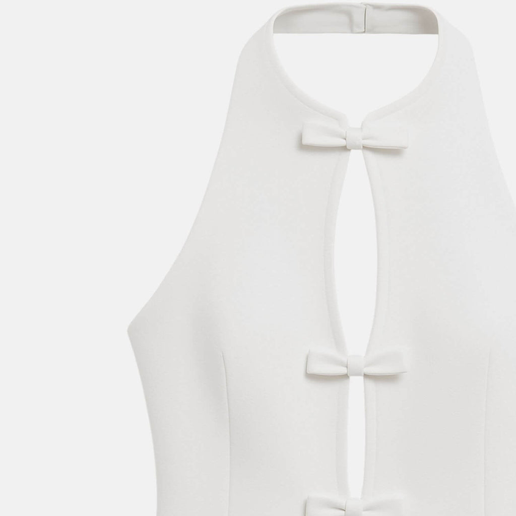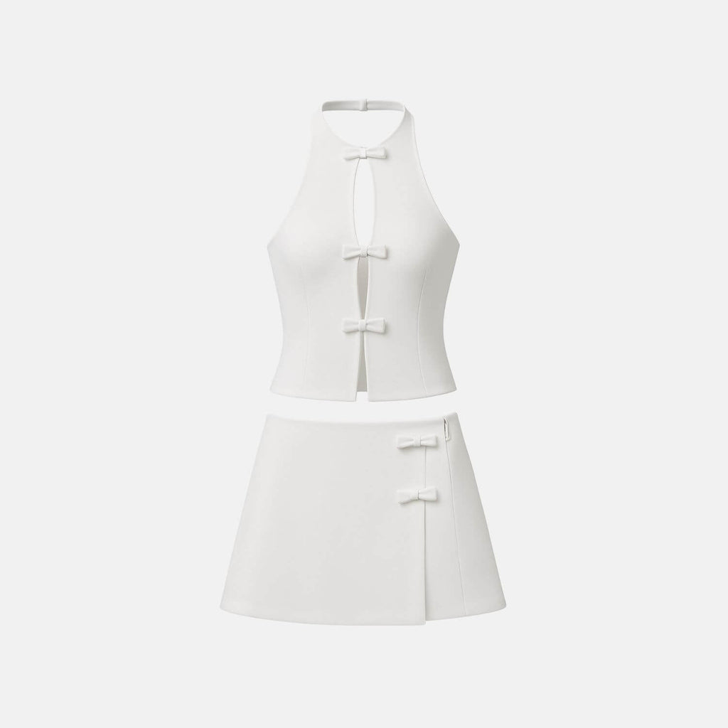 Conjunto de top e saia curta com aplicação de laços. Top com decote halter e recortes frontais. Saia transpassada com fecho lateral invisível. Acabamento encorpado com textura levemente granulada.
