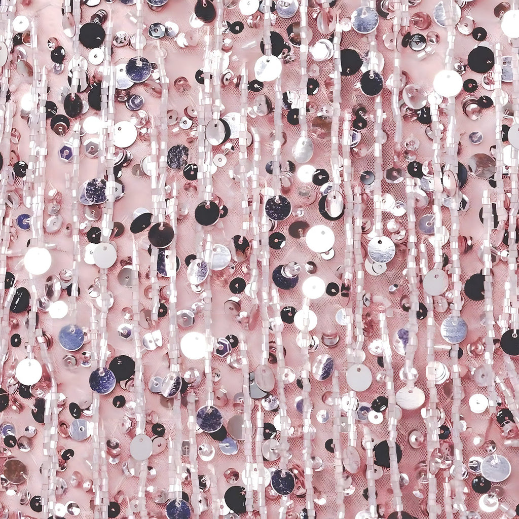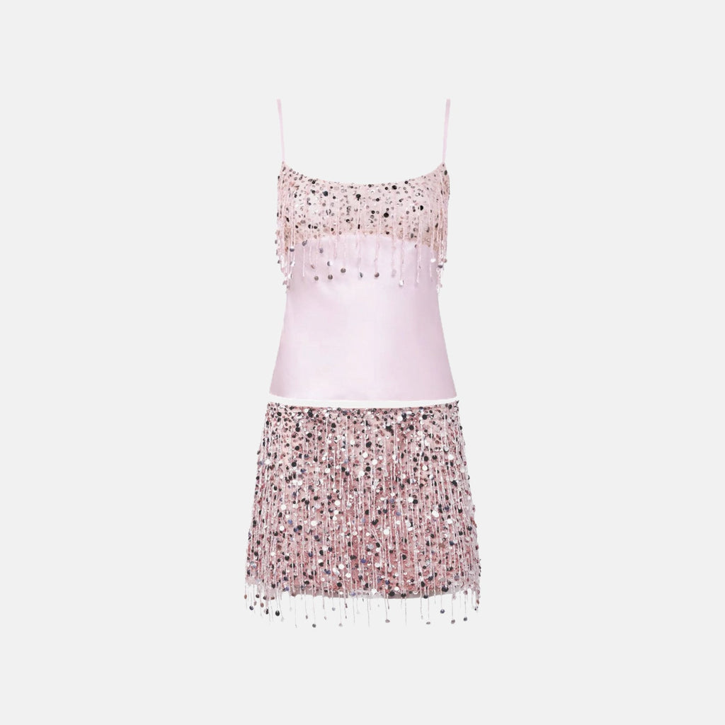 Conjunto composto por top de alças finas com busto em cetim e franjas de paetês, saia reta de cintura alta com tule bordado e franjas, acabamento interno forrado.