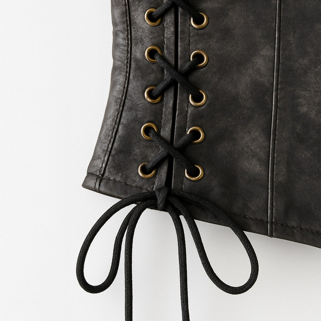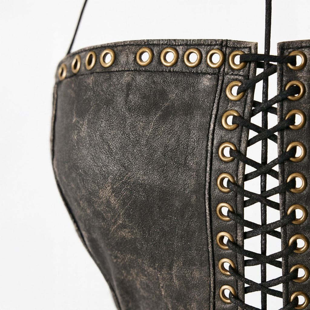 Top ajustável ao corpo com decote reto e acabamento corset. Ilhoses metálicos aplicados em toda a peça com amarrações frontais e laterais. Textura de couro envelhecido com costuras estruturadas.