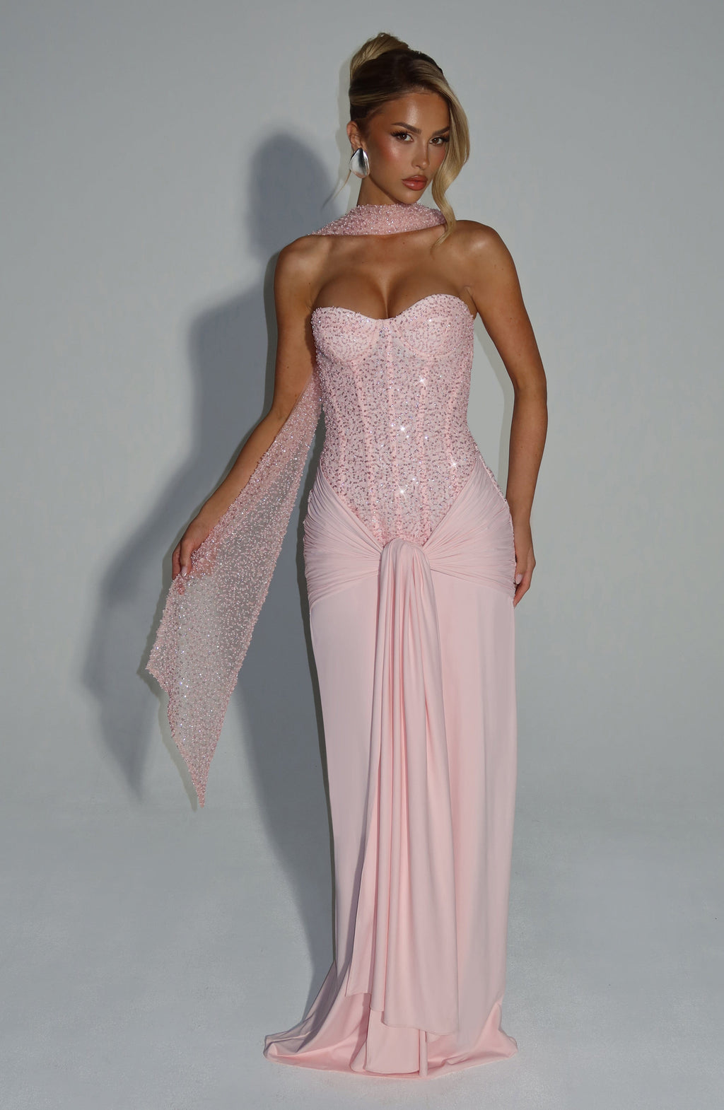 Elevate your ensemble with the Miya Scarf in a delicate blush hue. Crafted from embellished tulle, this scarf drapes gracefully around the neck, adding a refined touch to any outfit. Perfectly paired with the Sapphire Mini Dress, it enhances your look with subtle elegance and sophistication.