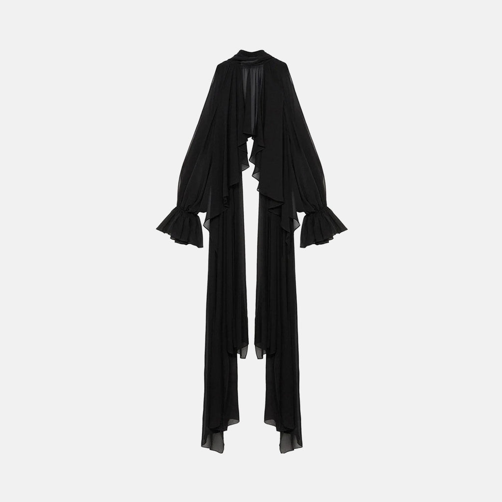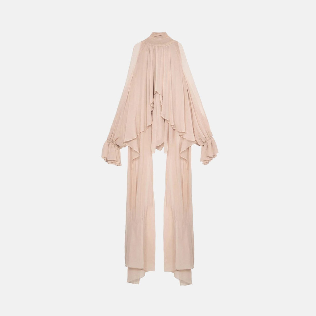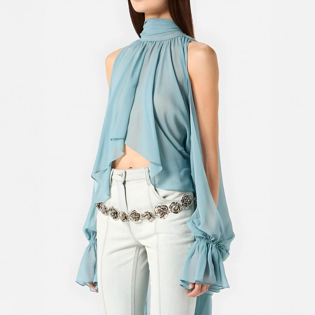 Blusa cropped de chiffon com caimento fluido. Detalhe de gola alta drapeada, ombros à mostra e mangas amplas com punhos franzidos. Costas abertas com amarração e comprimento alongado na parte traseira.
