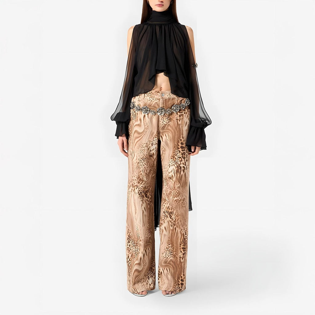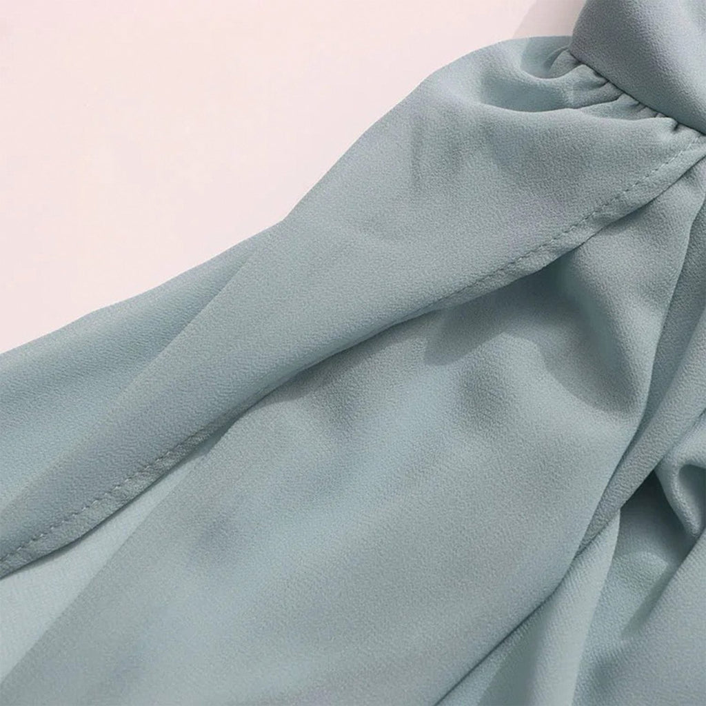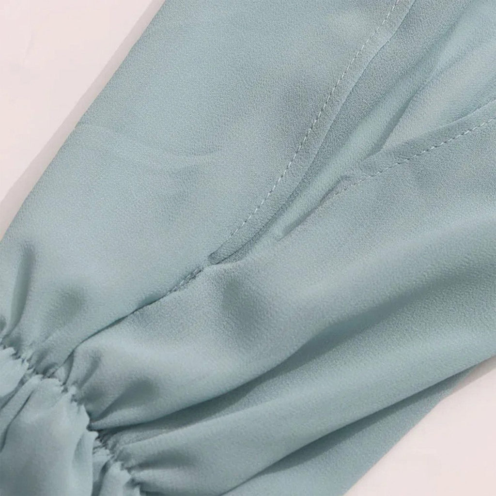 Blusa cropped de chiffon com caimento fluido. Detalhe de gola alta drapeada, ombros à mostra e mangas amplas com punhos franzidos. Costas abertas com amarração e comprimento alongado na parte traseira.