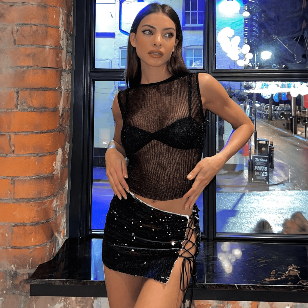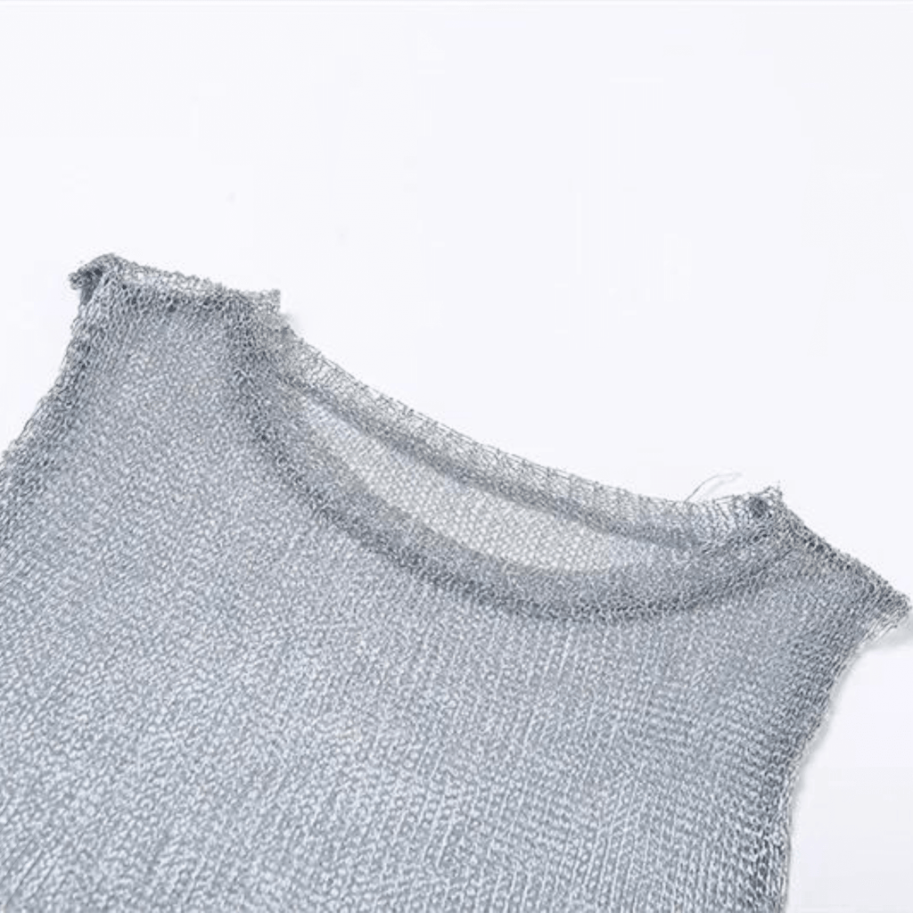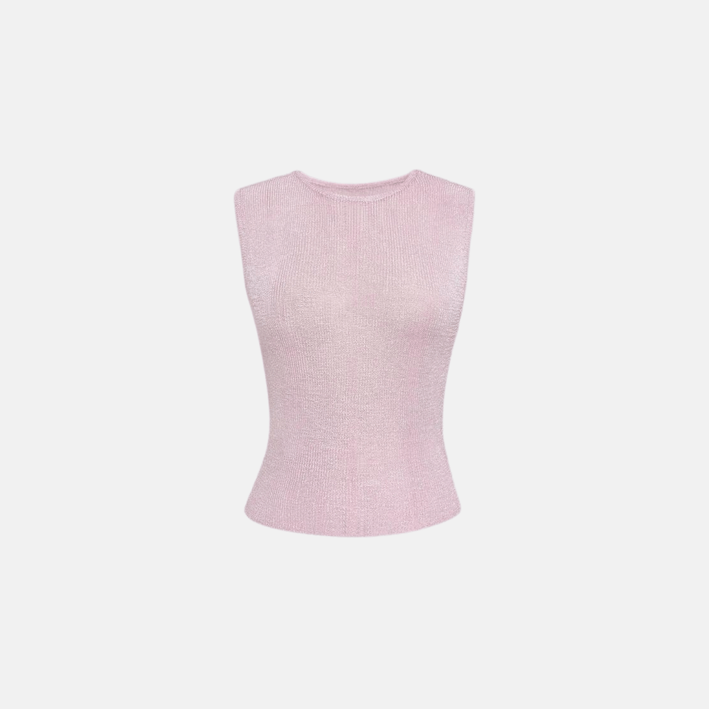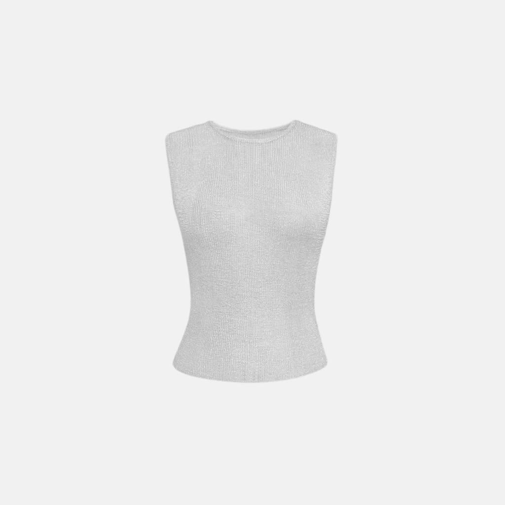 Top sem mangas com decote redondo. Ajuste justo ao corpo com textura brilhante. Acabamento em tecido metálico, proporcionando um visual sofisticado. Sem fecho.