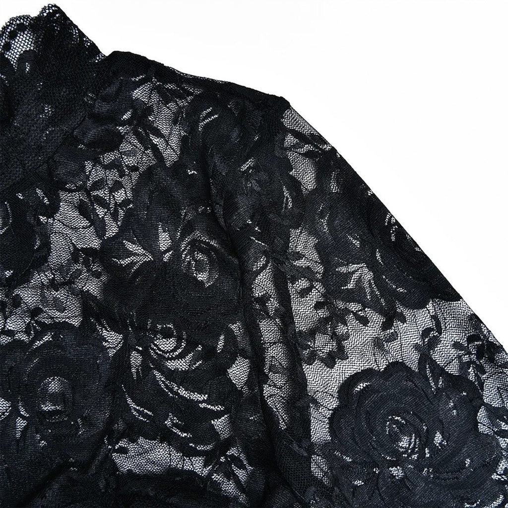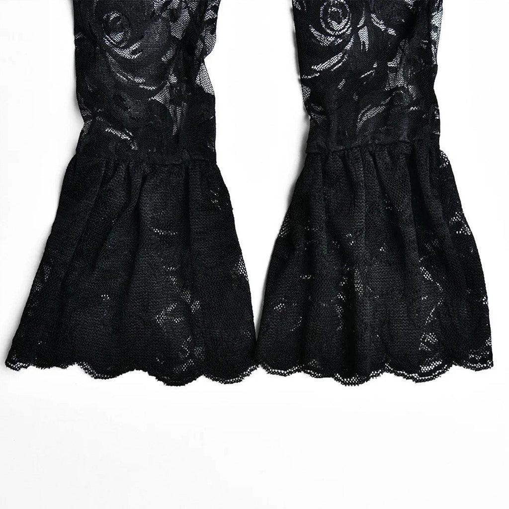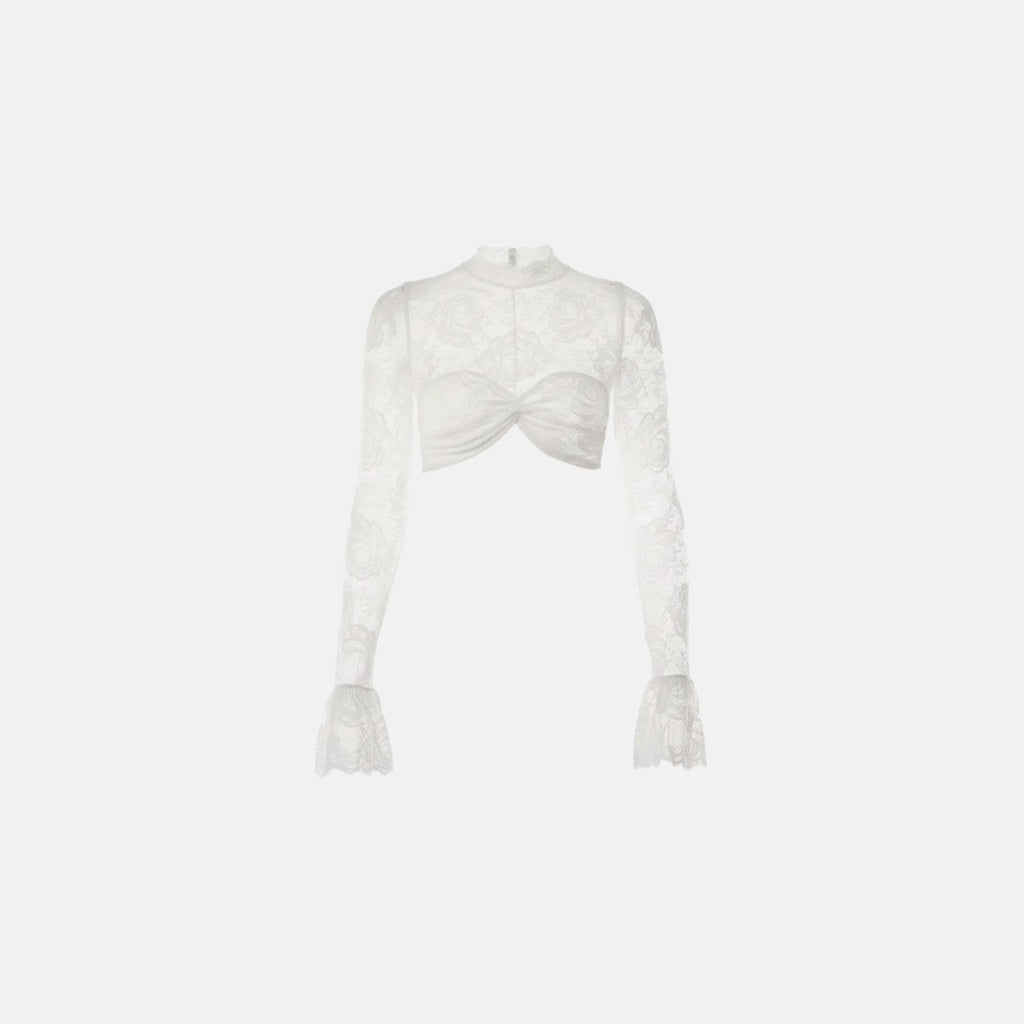 Top cropped de renda floral transparente. Manga longa ajustada com punhos flare em acabamento ondulado. Decote fechado com gola rendada. Recorte frontal torcido estruturado no busto. Fecho posterior discreto.
