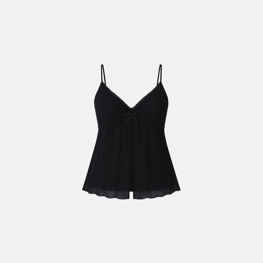 Top com alças finas ajustáveis e decote em V. Recorte torcido central com laço aplicado e barra levemente rodada. Versão rendada apresenta transparência floral, enquanto a lisa possui acabamento suave e opaco.