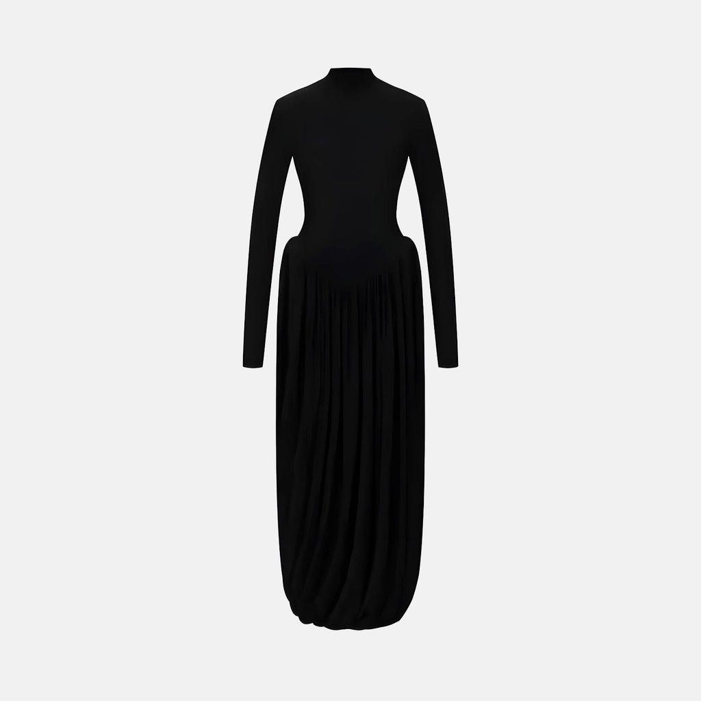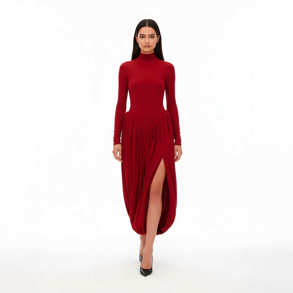Vestido longo com gola alta e mangas longas. Modelagem estruturada no busto e cintura marcada. Saia volumosa com efeito drapeado balonê e fenda lateral acentuada. Costas com recorte em abertura oval e fecho superior em botão.