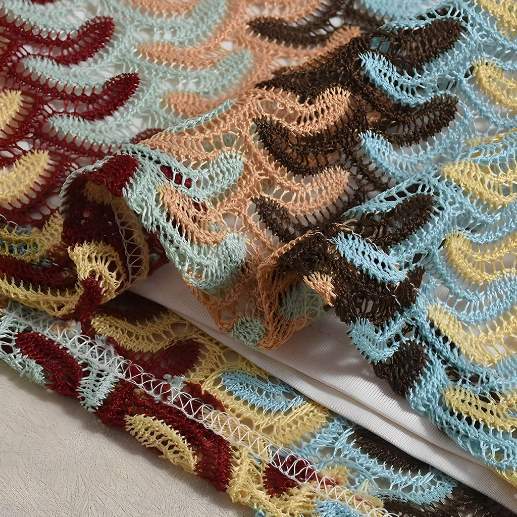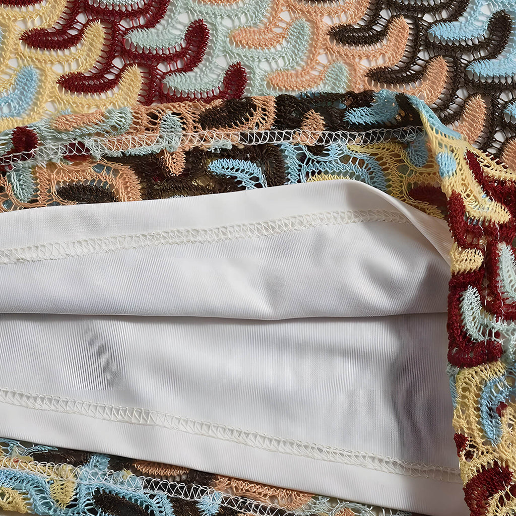 Vestido curto de um ombro só com modelagem ajustada. Renda colorida com padrão em ondas e transparência parcial. Forro embutido e acabamento interno com costura elástica.