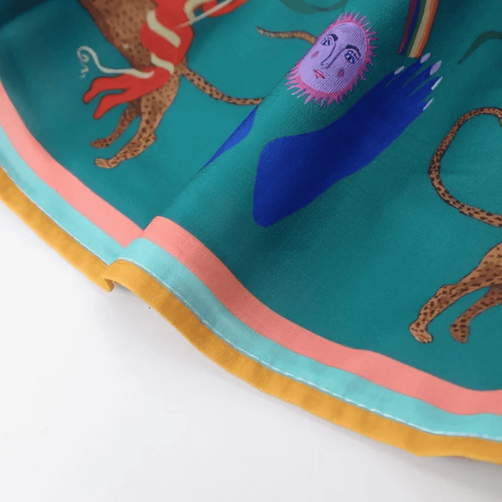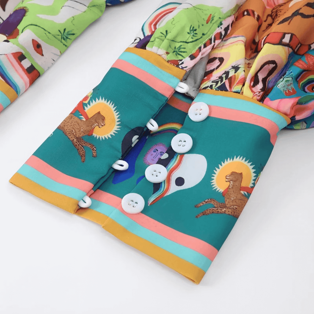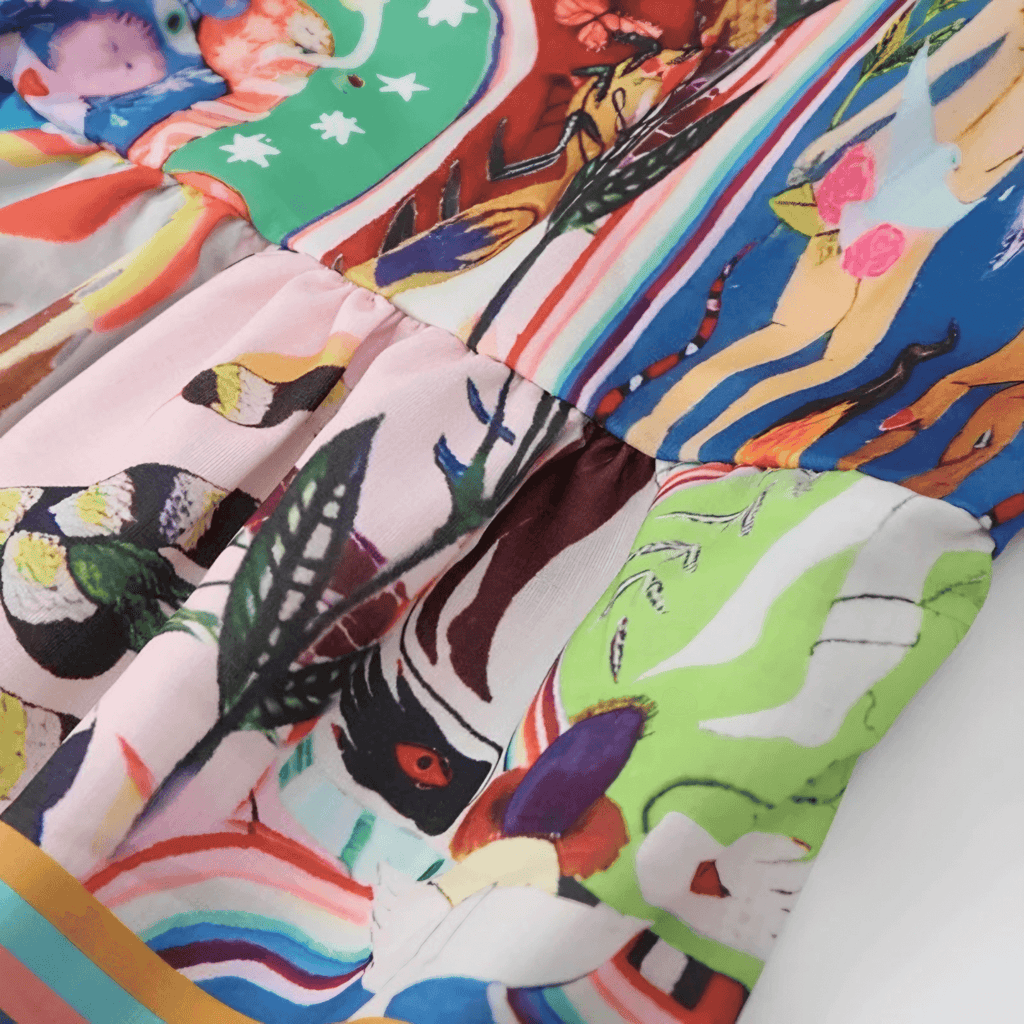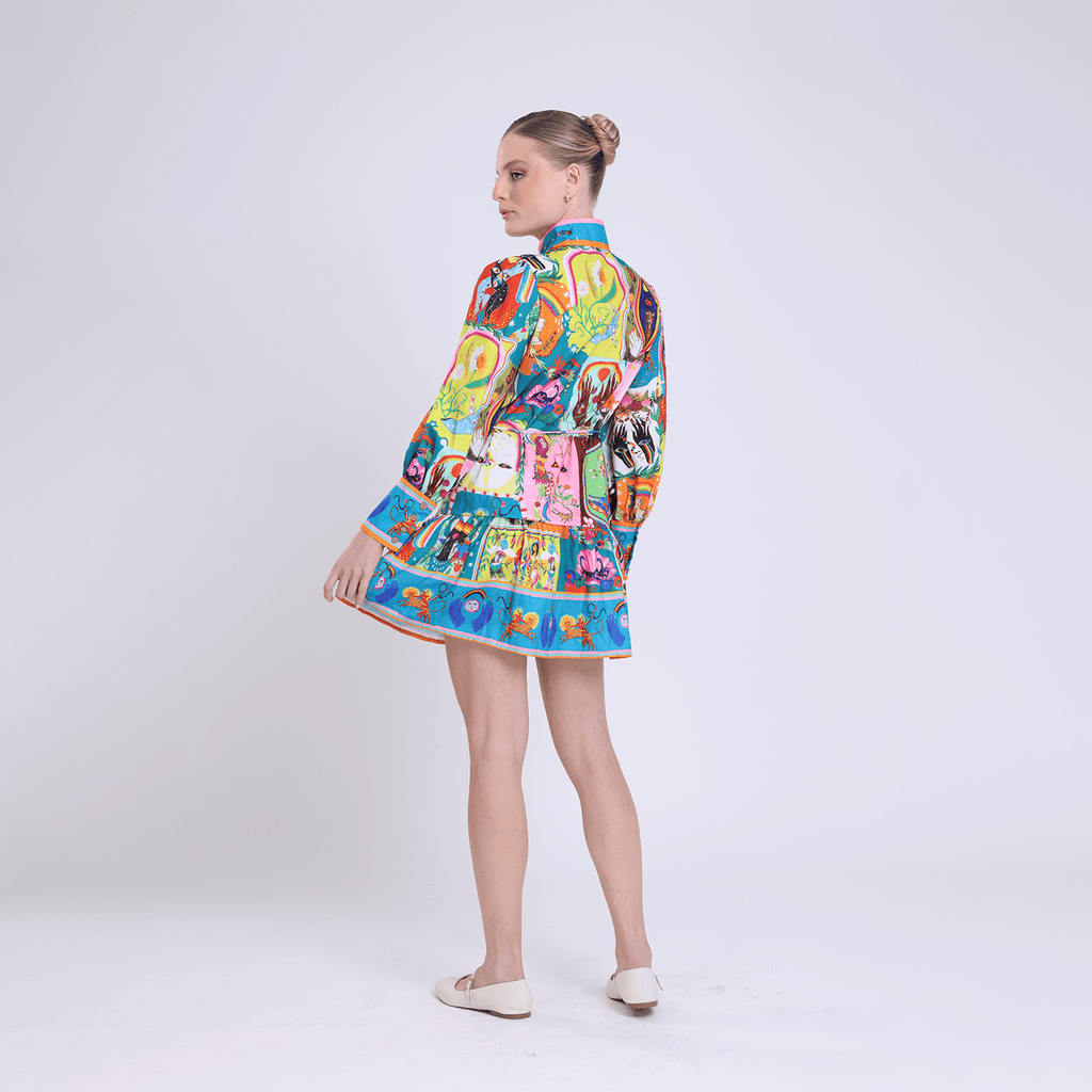 Vestido curto com estampa vibrante e detalhes bordados. Modelagem soltinha, com mangas bufantes e babado na barra. Fechamento frontal com botões e amarração na cintura.