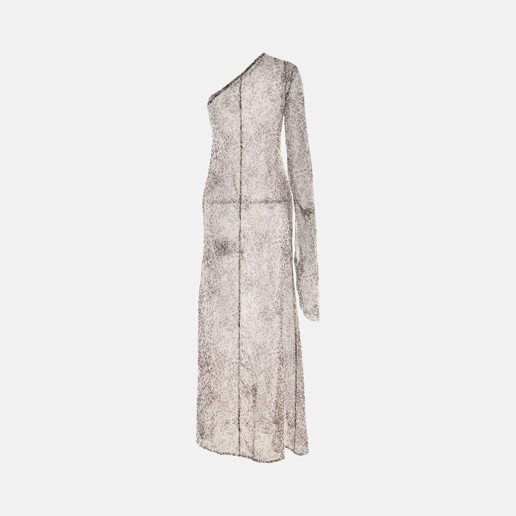 Vestido longo de um ombro só com estampa animal print em tons neutros e efeito esfumado. Modelagem reta com caimento fluido, fenda lateral discreta e manga longa única com acabamento solto.