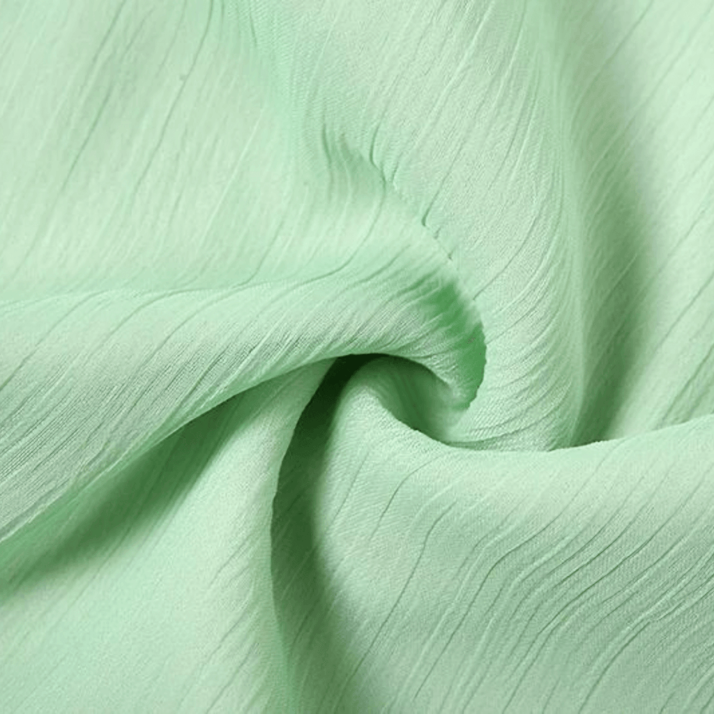 Vestido verde claro com alças largas, busto estruturado e saia rodada com babados. Fecho nas costas. Tecido leve e fluido.
