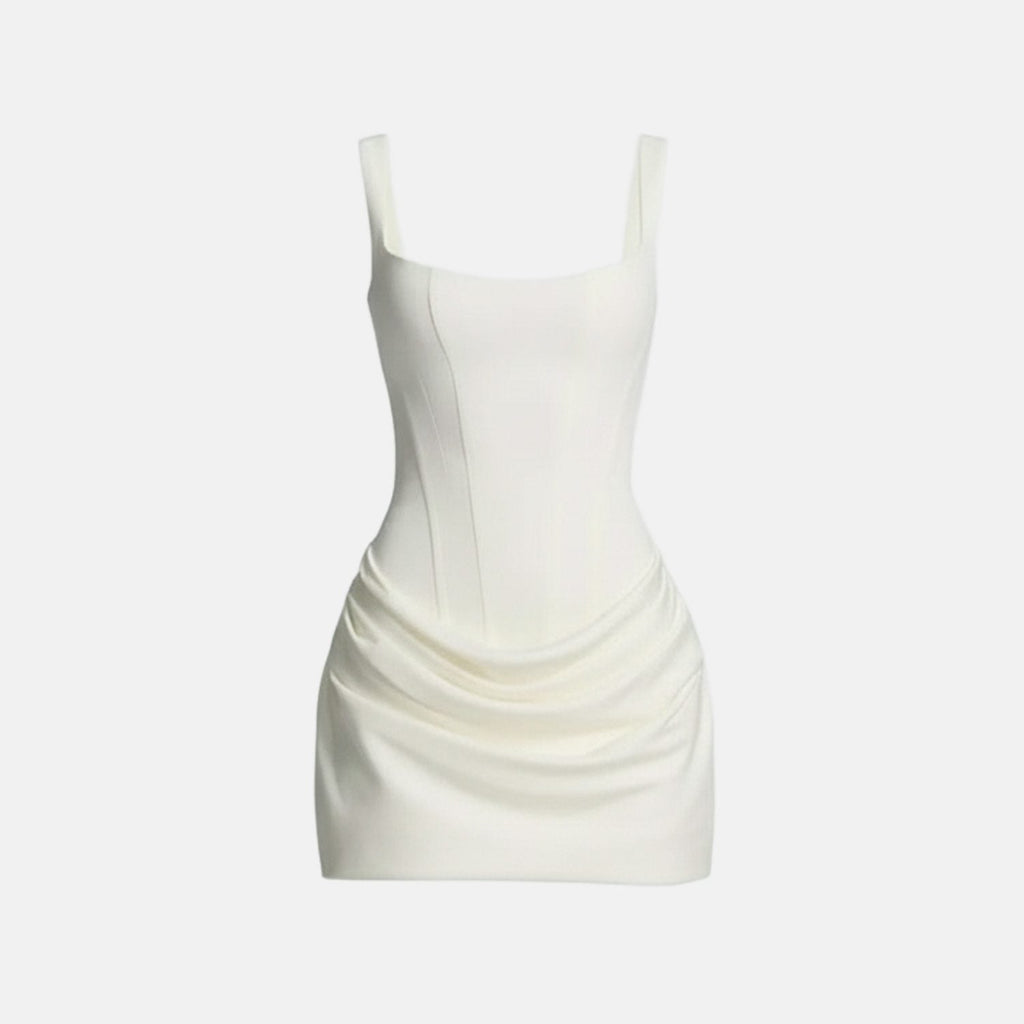 Vestido curto com decote reto e alças largas. Estrutura ajustada com recortes verticais que modelam o corpo. Saia com drapeado frontal e posterior. Costas com fecho em amarração estilo espartilho.