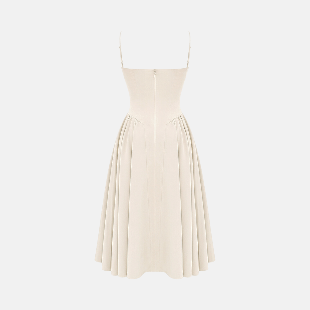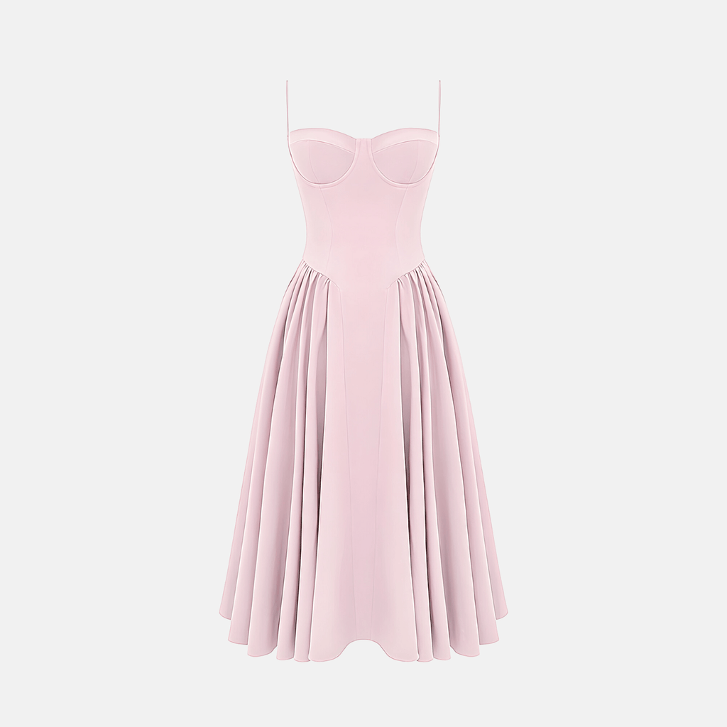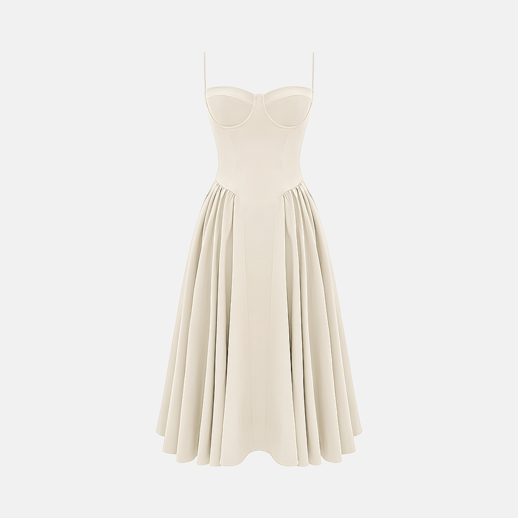 Vestido midi com alças finas e estrutura ajustada ao corpo. Decote em formato de coração com recortes no busto. Saia ampla e fluida com pregas sutis.