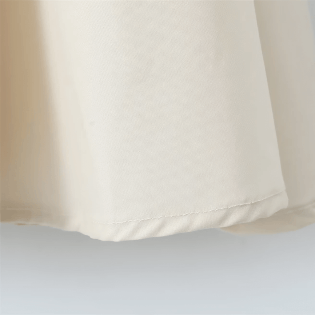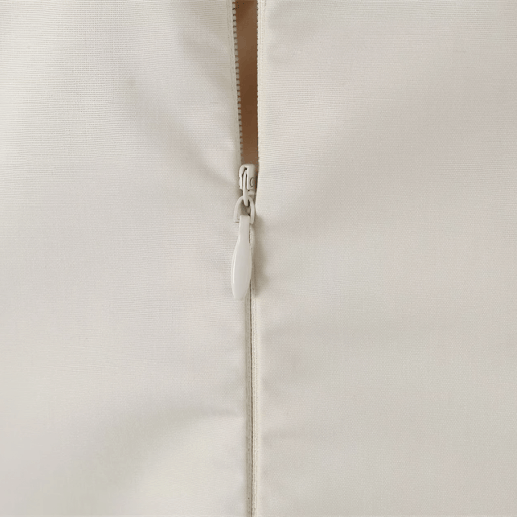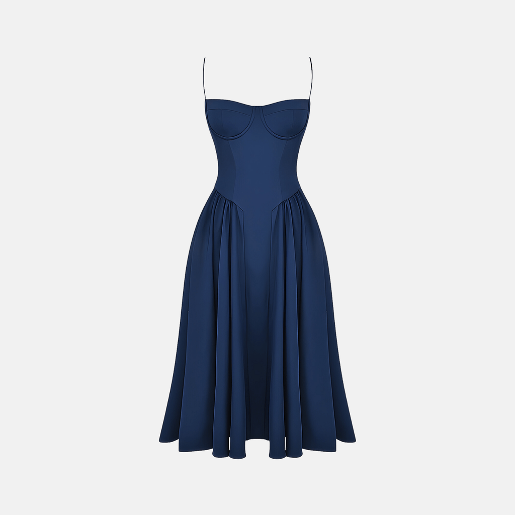 Vestido midi com alças finas e estrutura ajustada ao corpo. Decote em formato de coração com recortes no busto. Saia ampla e fluida com pregas sutis.