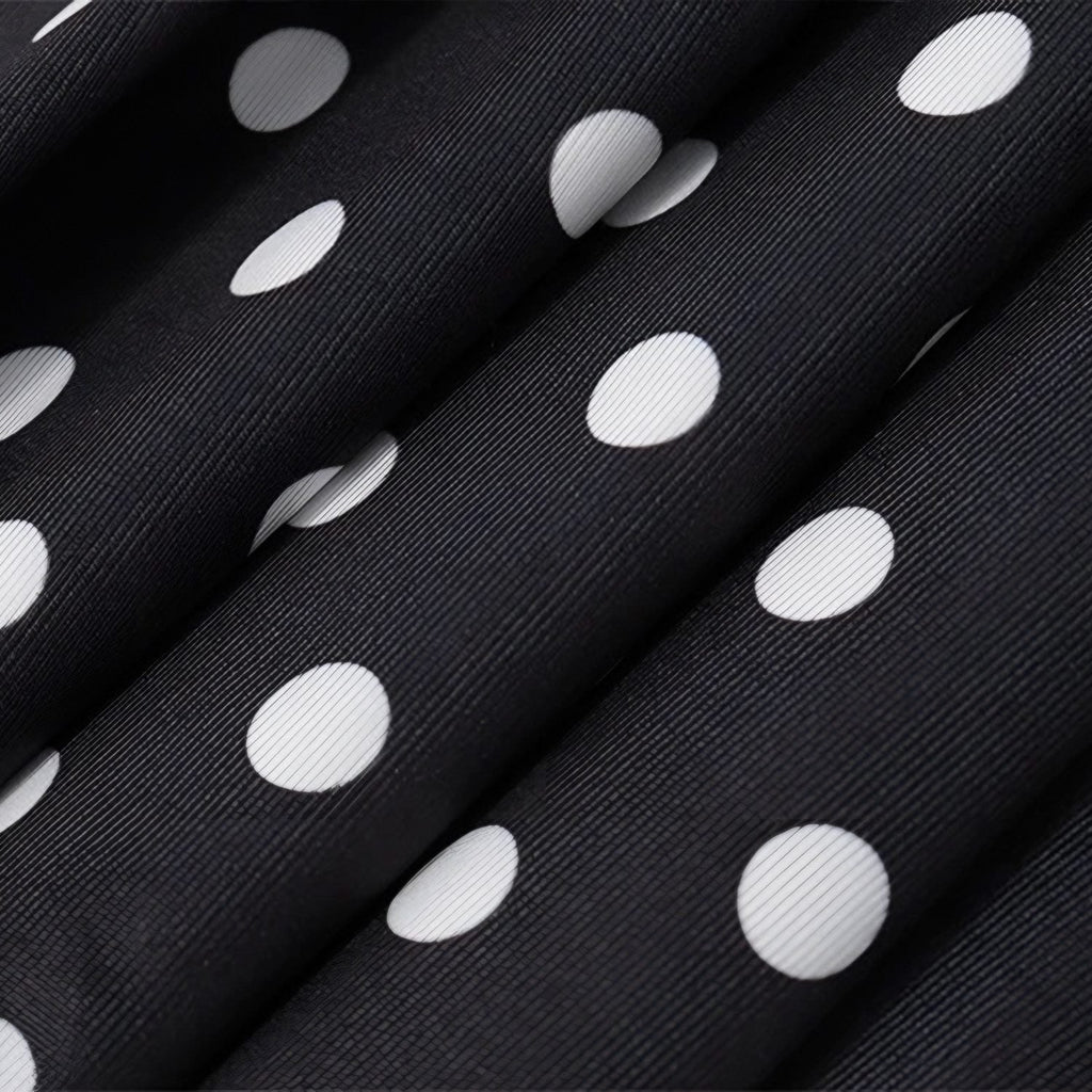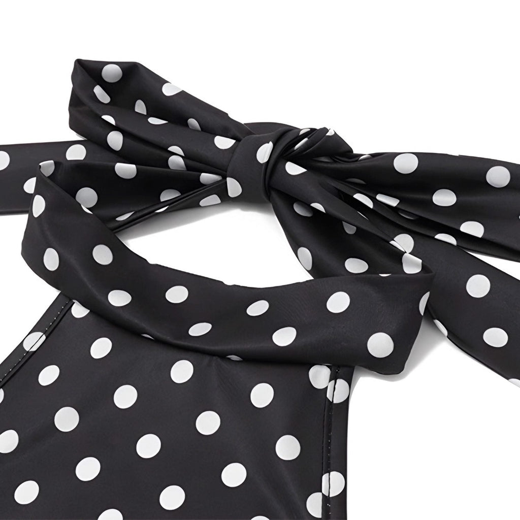 Vestido curto com estampa de poás. Modelagem soltinha com decote halter e amarração nas costas em laço. Recorte aberto nas costas. Acabamento com costuras aparentes e barra simples.