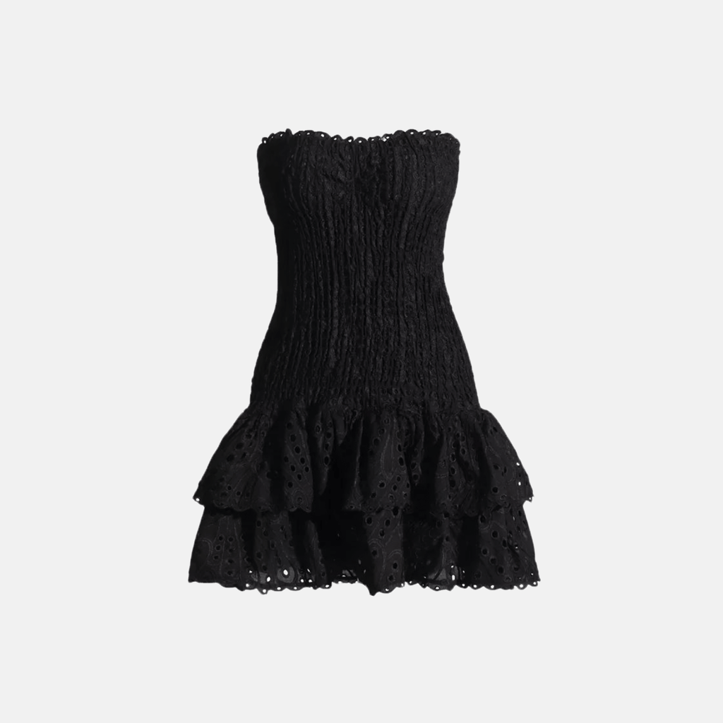 Vestido encantador ajustável ao corpo. sem alças e com decote barrado. comprimento acima dos joelhos com detalhes bordados.Material • Algodão e Elastex