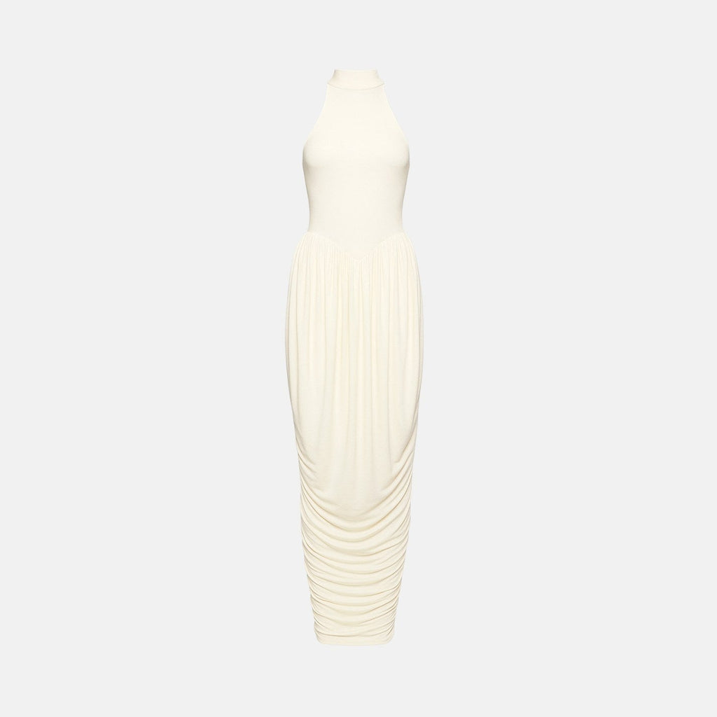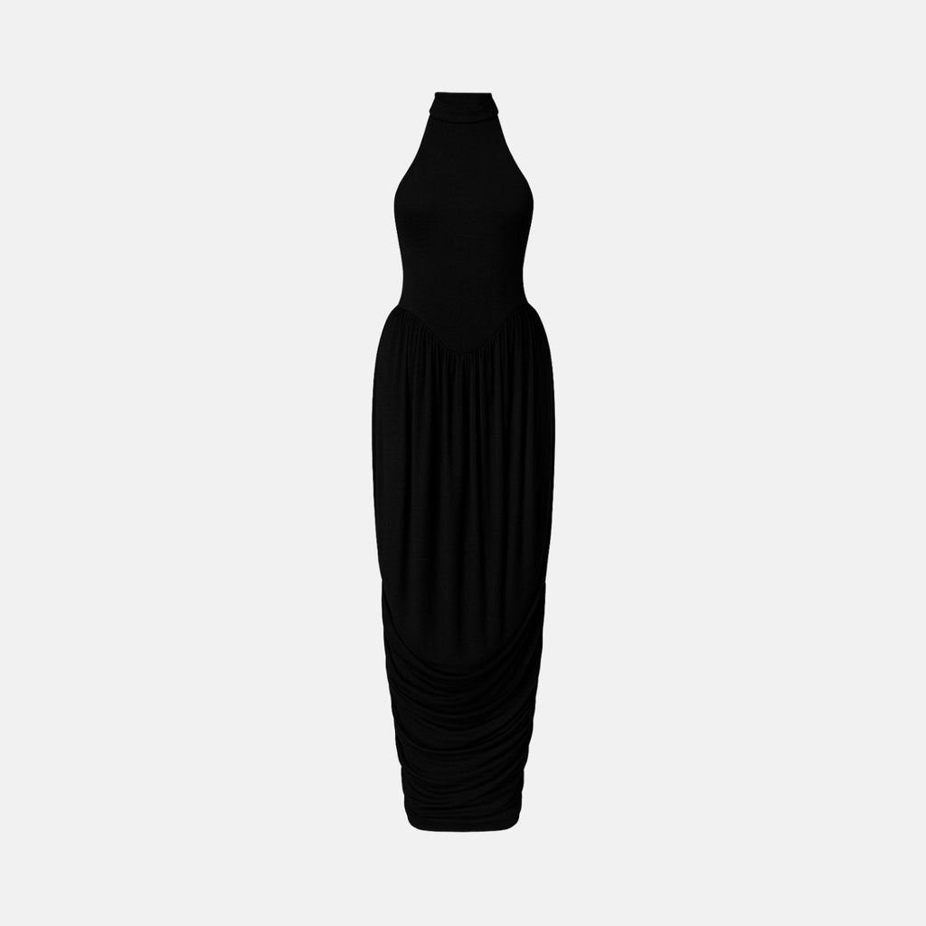 Vestido longo de gola alta com decote halter. Modelagem ajustada no busto e cintura marcada. Saia alongada com efeito drapeado frontal e caimento estruturado. Costas estilo nadador com fecho posterior discreto.