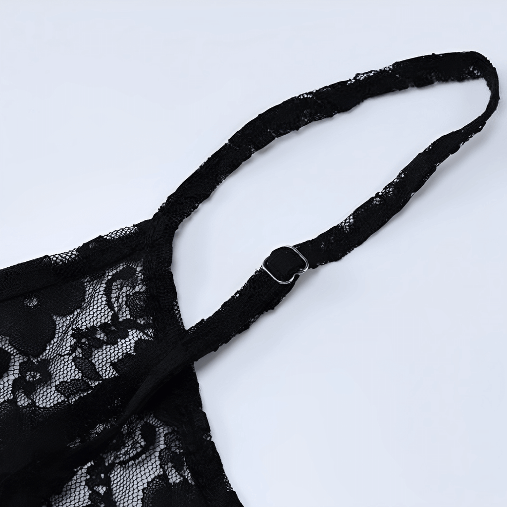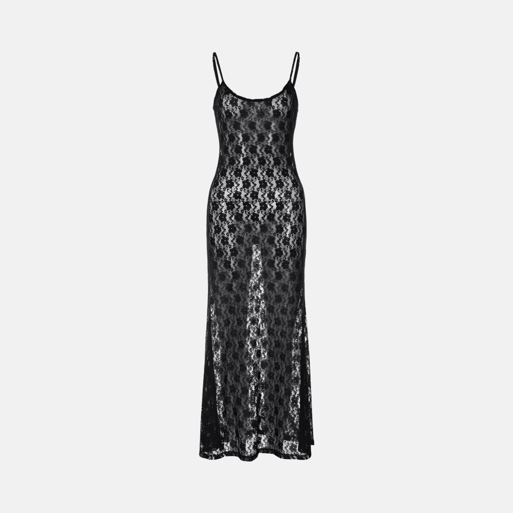 Vestido longo com alças finas ajustáveis e padrão rendado transparente. Decote arredondado e costas abertas com amarração delicada. Corte justo ao corpo.