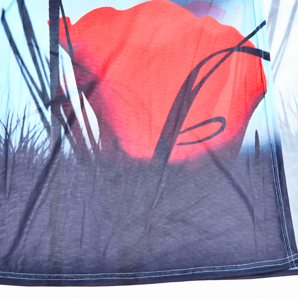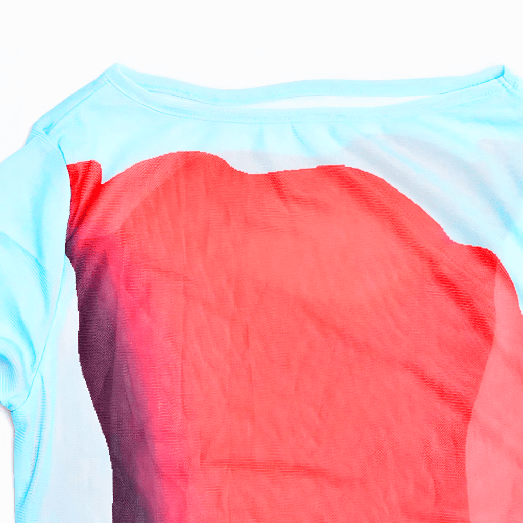 Vestido longo de manga longa ajustada. Estampa abstrata em tons vibrantes. Decote canoa e fenda traseira discreta para mobilidade.