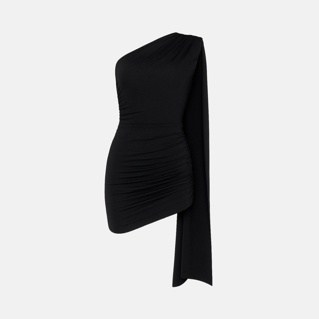 Vestido curto assimétrico de um ombro só. Modelagem ajustada ao corpo com drapeados laterais. Detalhe de faixa longa aplicada no ombro. Barra reta e acabamento interno com costura reforçada.