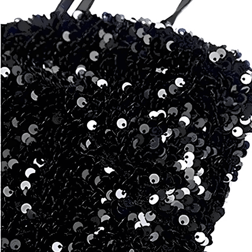 Vestido médio revestido com lantejoulas brilhantes. Fecho nas costas com zíper.