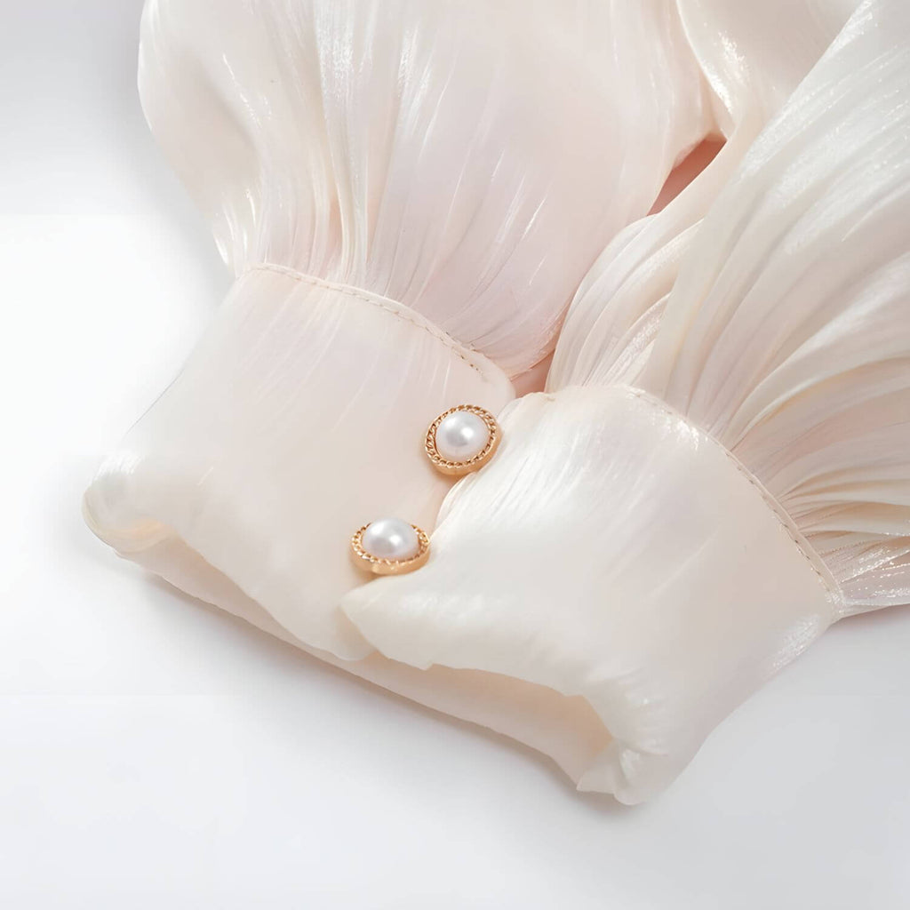 Vestido curto com mangas longas bufantes e amarração no decote. Cintura marcada por faixa drapeada ajustável. Saia em camadas com acabamento ondulado. Tecido leve com brilho perolado.