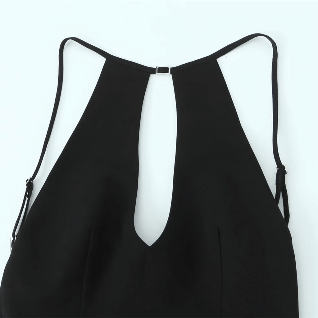 Vestido curto com decote frontal em gota. Alças finas ajustáveis e costas com detalhe de recorte. Fechamento posterior com zíper oculto.