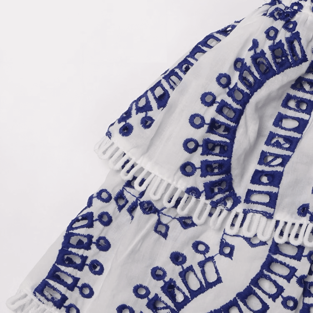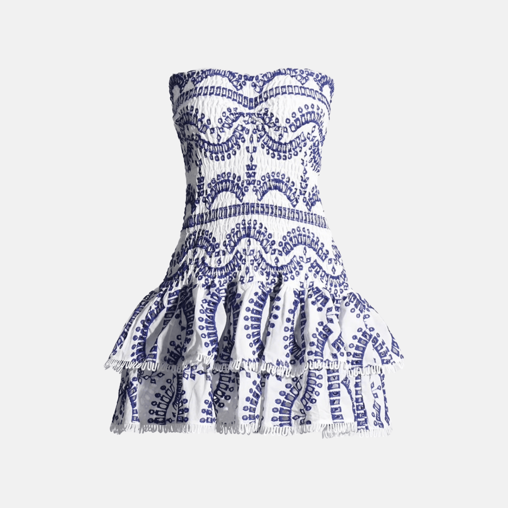 Vestido encantador ajustável ao corpo. sem alças e com decote barrado. comprimento acima dos joelhos com detalhes bordados da cor branca e azul.