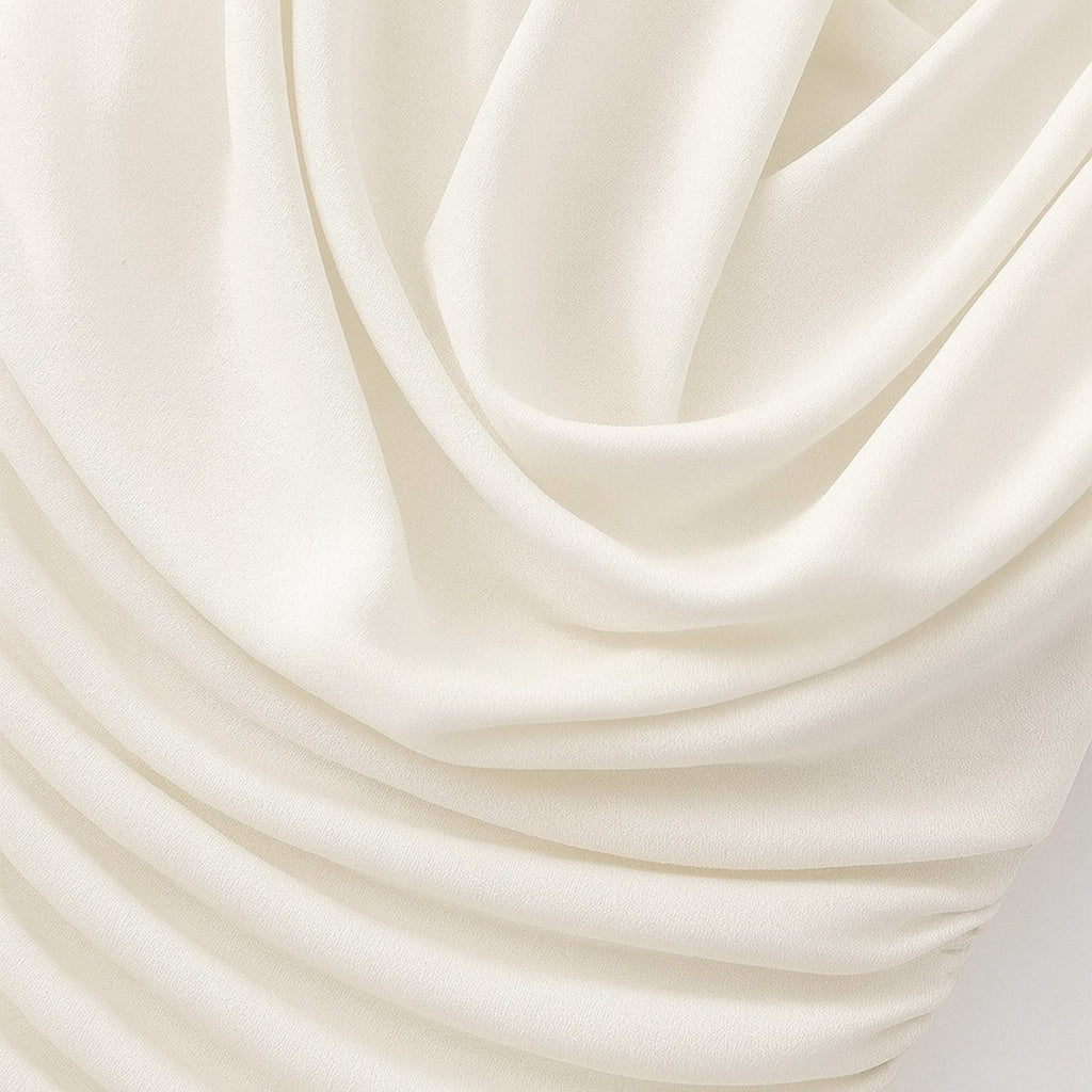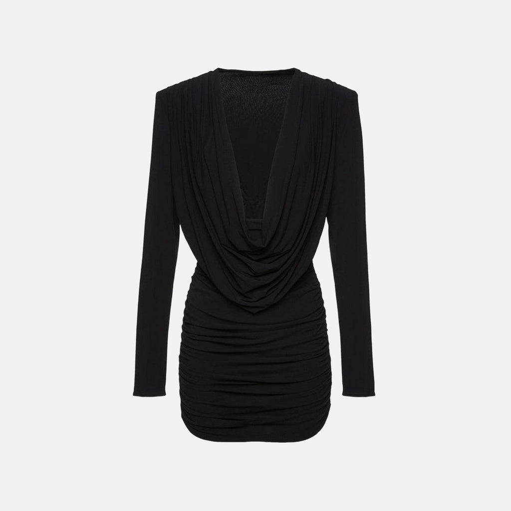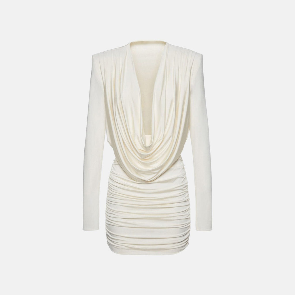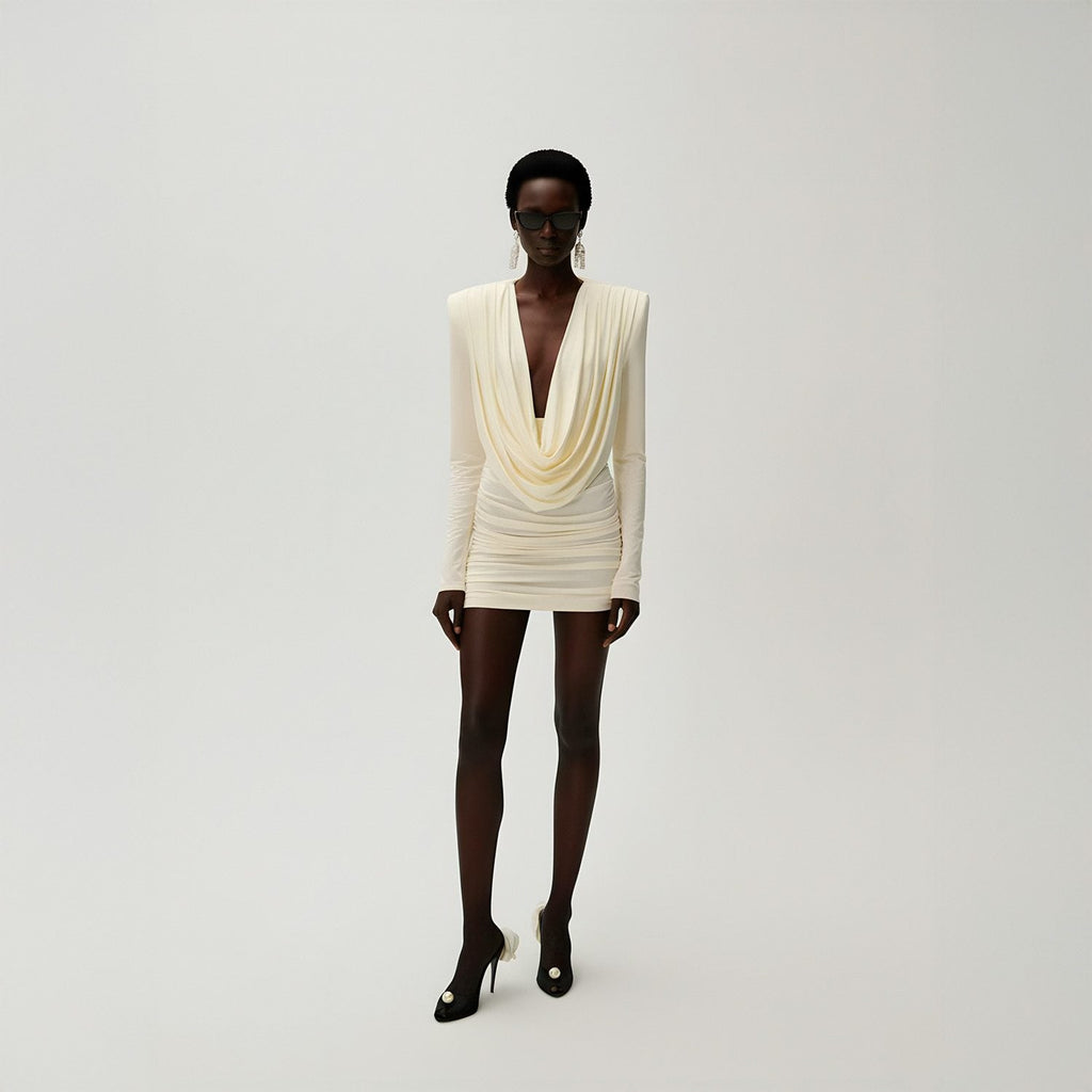 Vestido curto de manga longa com ombreiras estruturadas. Decote profundo em efeito drapeado frontal. Saia ajustada ao corpo com pregas horizontais. Acabamento limpo, costuras reforçadas e caimento fluido do tecido.