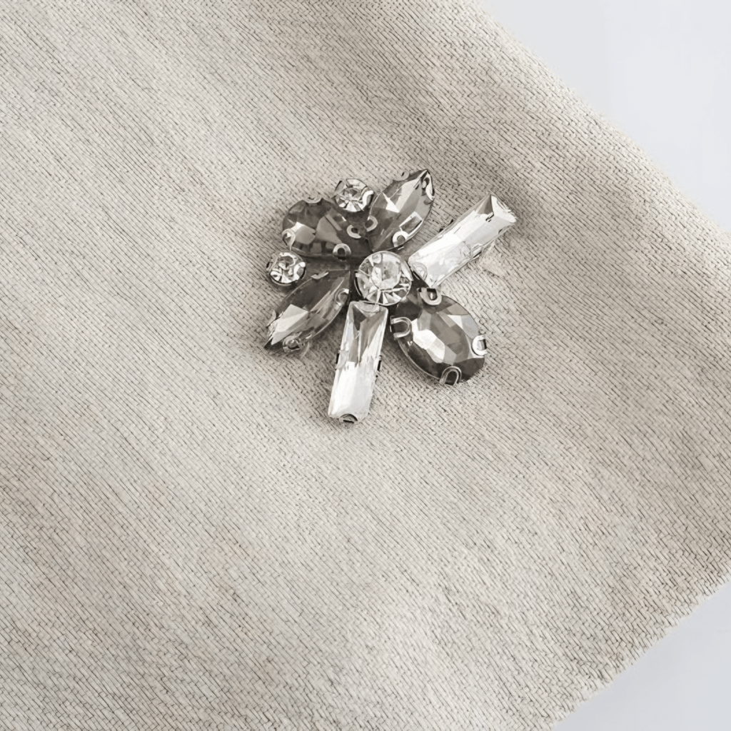 Vestido bordado de jóias na frente. Decote em V e alças finas. Fecho atrás com zíper oculto.Material • Linho