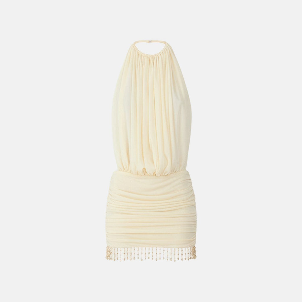 Vestido curto frente única com decote halter e amarração no pescoço. Parte superior drapeada com caimento leve. Saia justa franzida, acabamento em franjas de pérolas aplicadas na barra. Costas abertas.