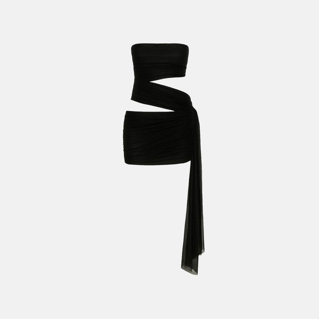 Vestido curto ajustável ao corpo. Modelo tomara que caia com recorte lateral e drapeado. Faixa longa de tule transparente presa na cintura com caimento fluido. Acabamento liso e costuras discretas.